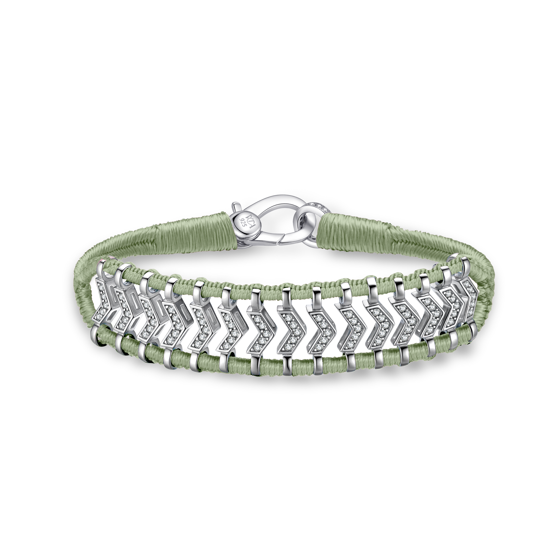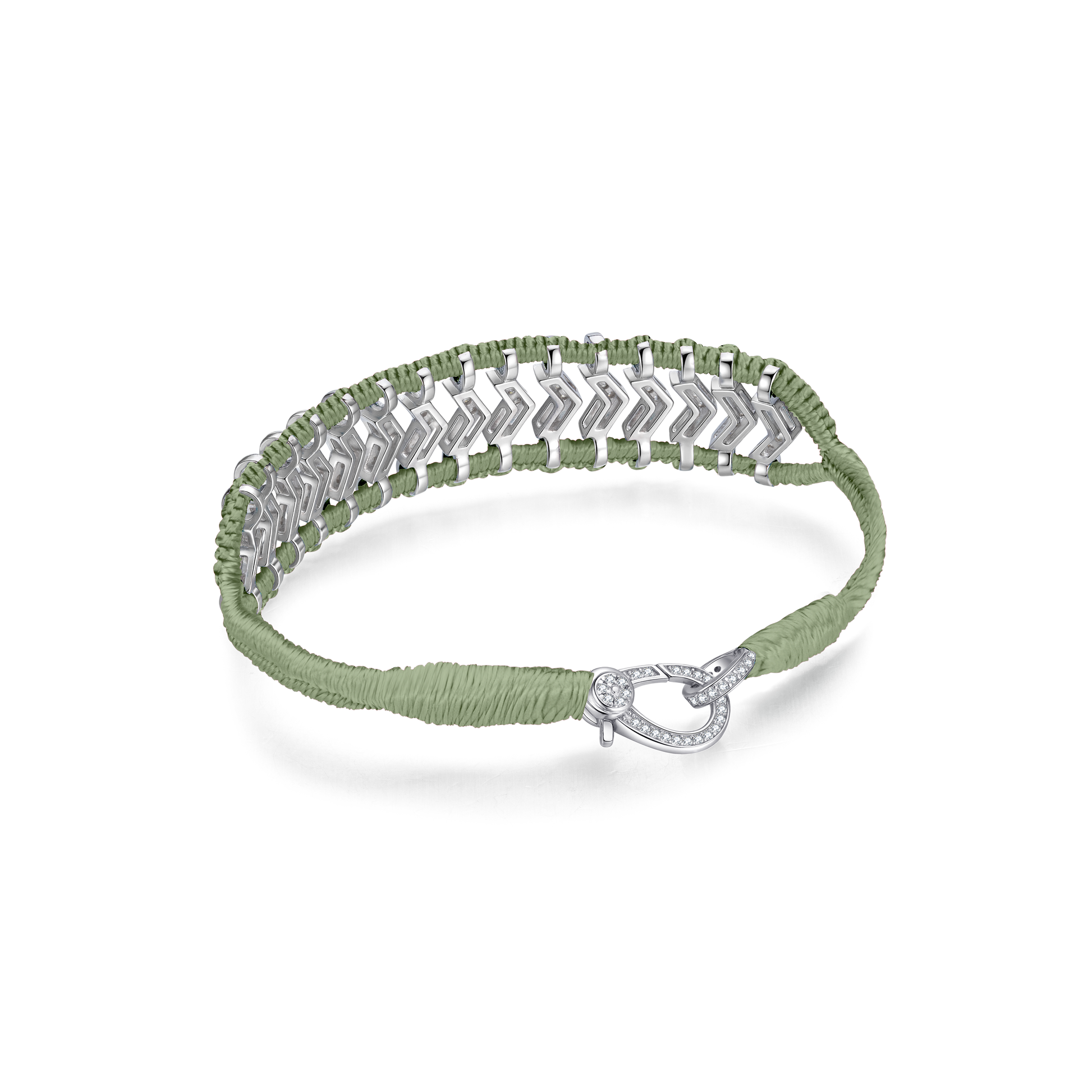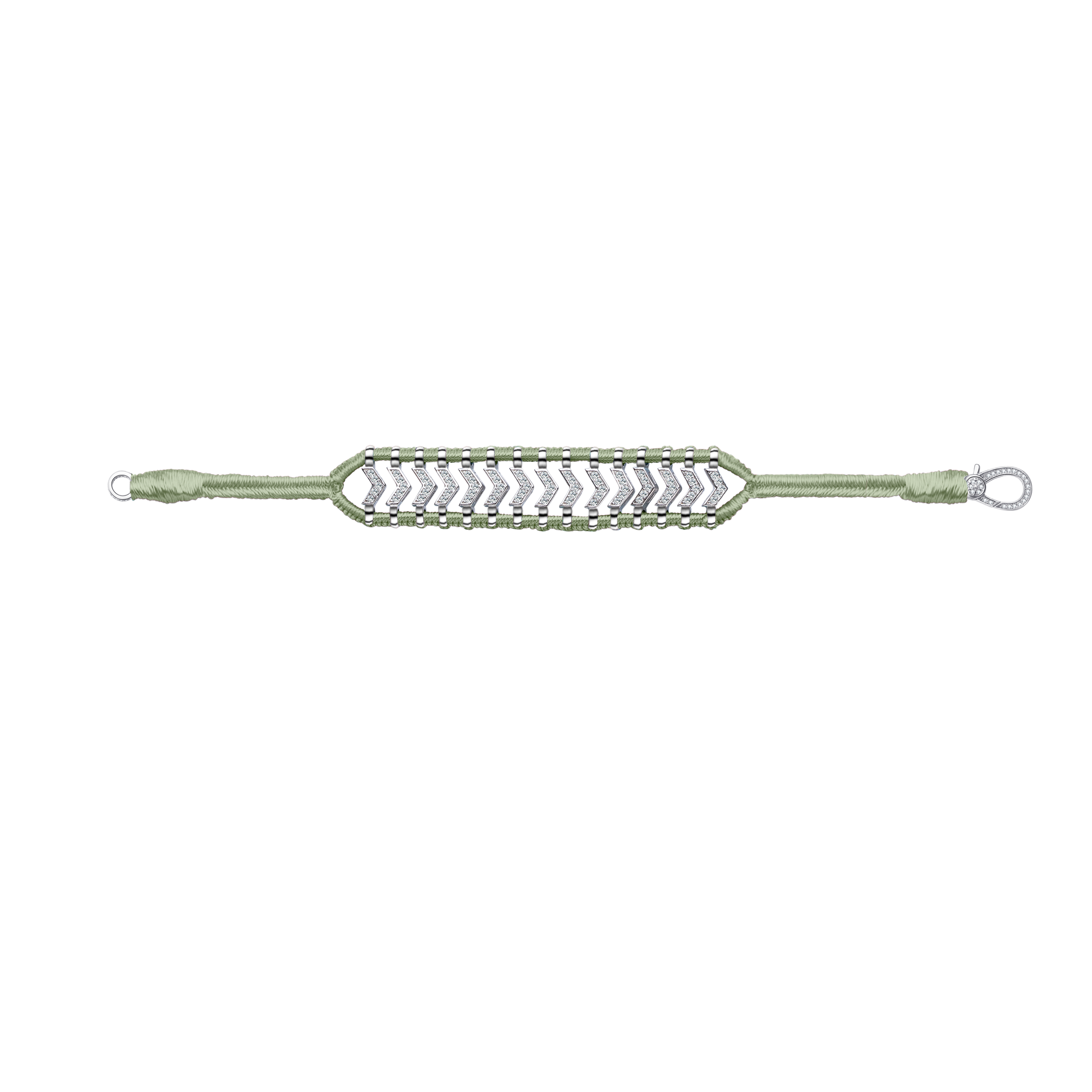 This bracelet in moss thread color will be your bohemian lucky summer. It is decorated with an openwork pattern in silver fully set with moissanites, which gives this piece a definitely precious look that you will love.