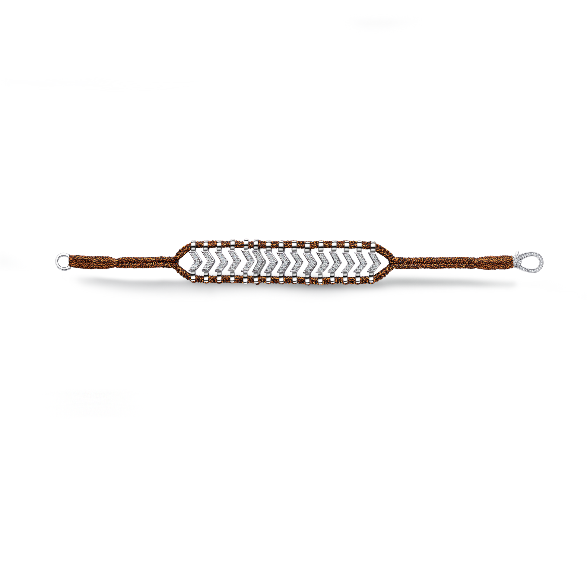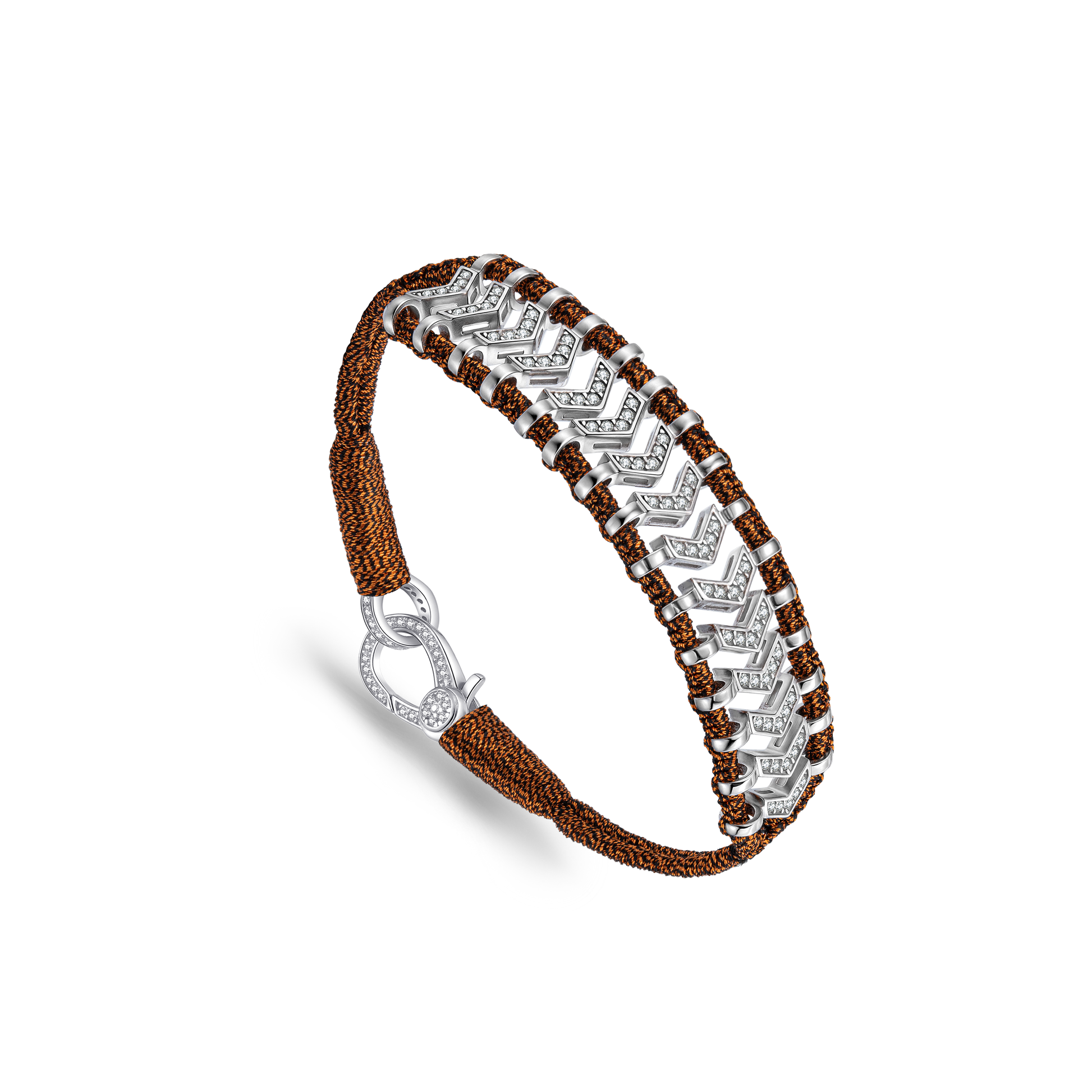 This bracelet in rusty thread color will be your bohemian lucky summer. It is decorated with an openwork pattern in silver fully set with moissanites, which gives this piece a definitely precious look that you will love.