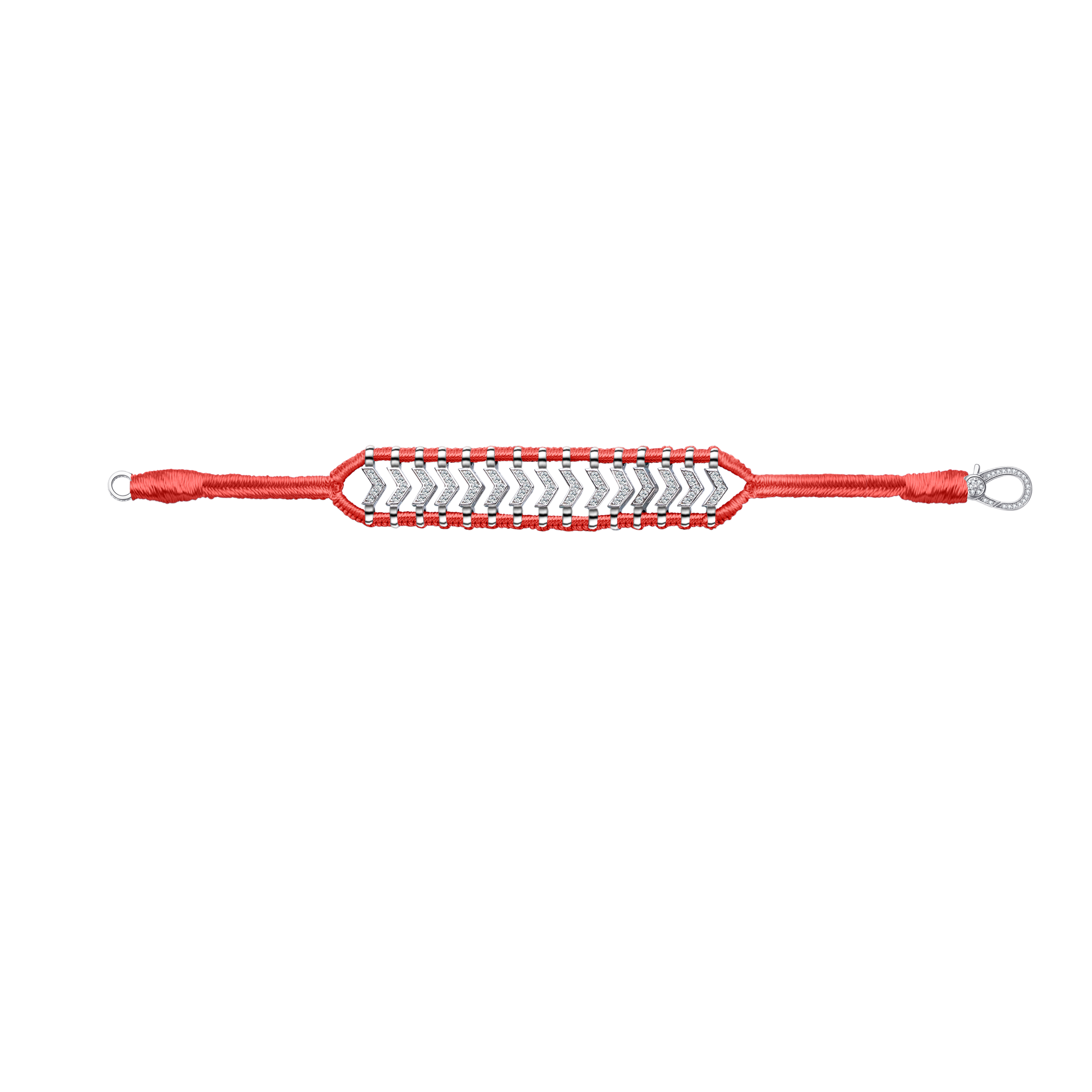 This bracelet in salmon thread color will beyour bohemian lucky summer. It is decorated with an openwork pattern in silver fully set with moissanites, which gives this piece a definitely precious look that you will love.