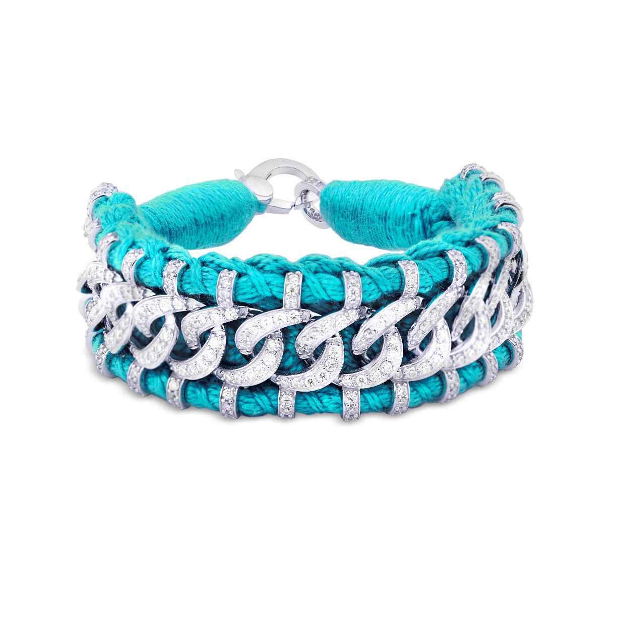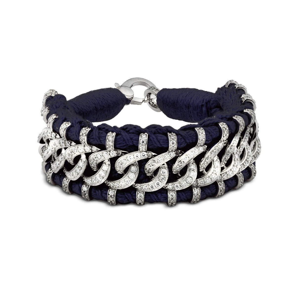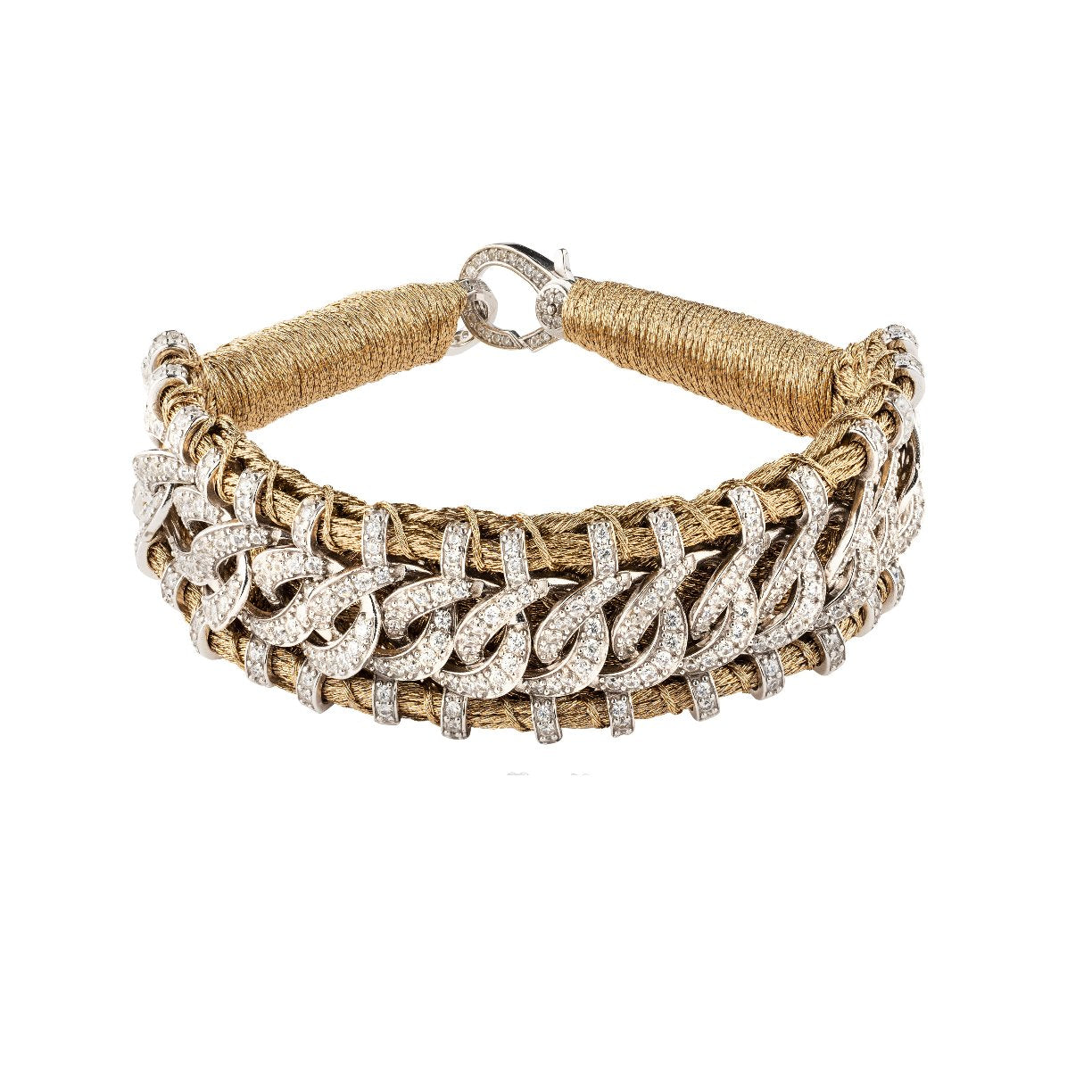 This sublime bracelet made of brass color thread and decorated with a silver motif resembling a chain with imposing links. The silver structure is set with more than 800 diamonds.