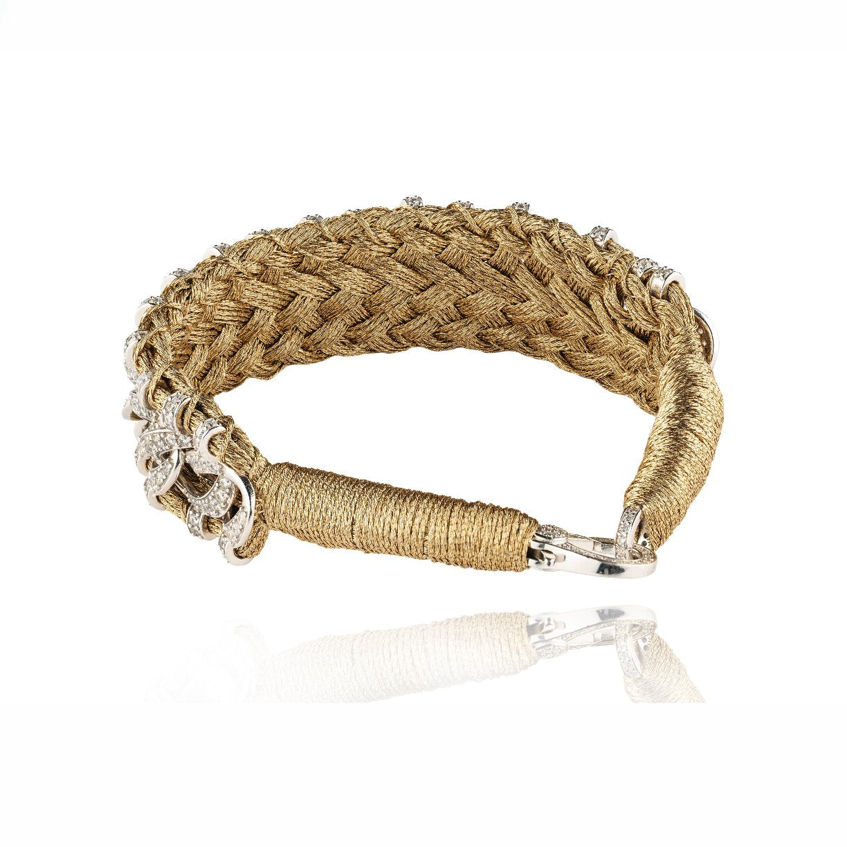 Bracelet in brass-colored braided lurex thread, decorated with a 925 silver motif and set with a multitude of diamonds .