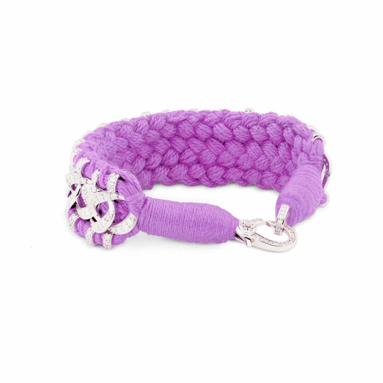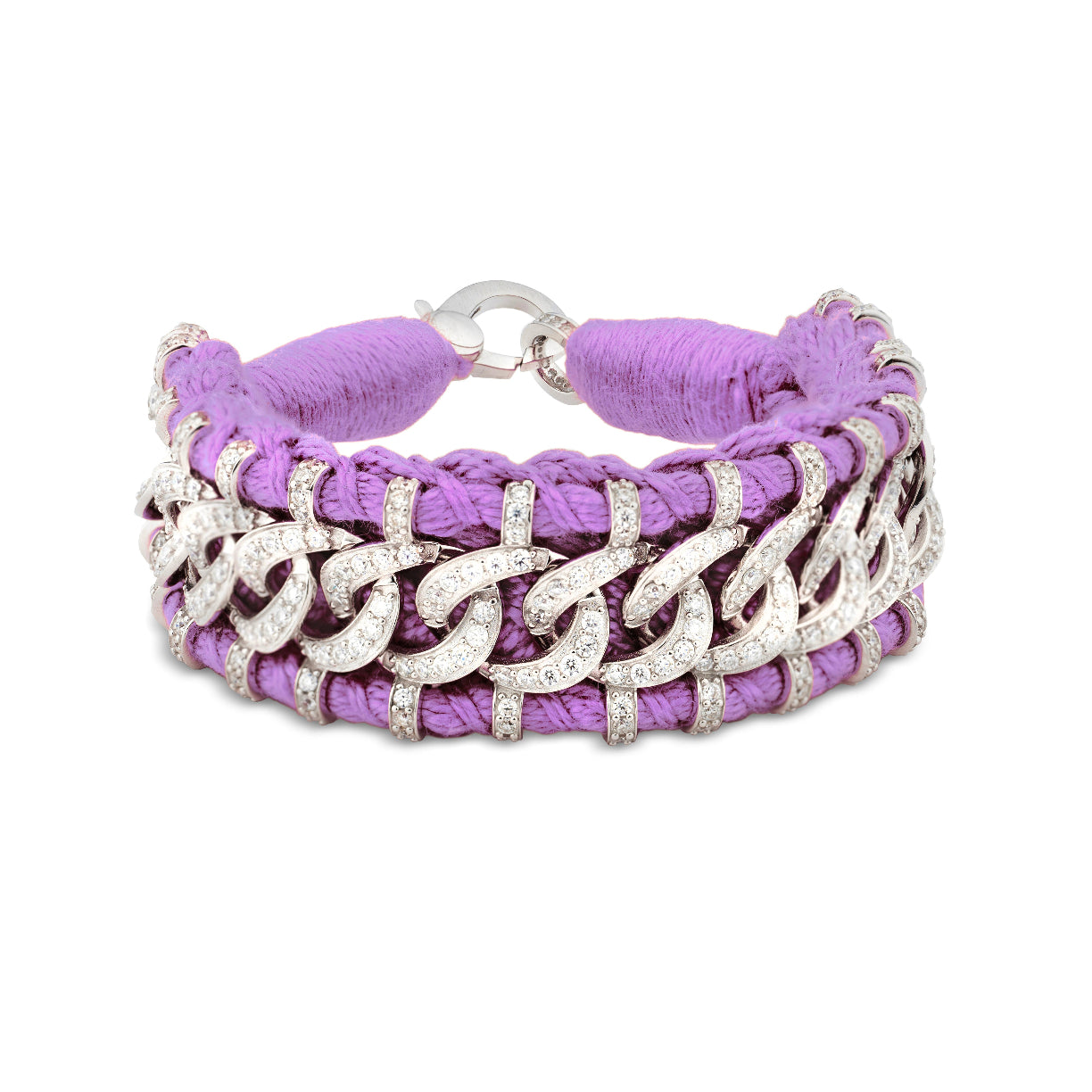 This sublime bracelet made of purple color thread and decorated with a silver motif resembling a chain with imposing links. The silver structure is set with more than 800 diamonds.