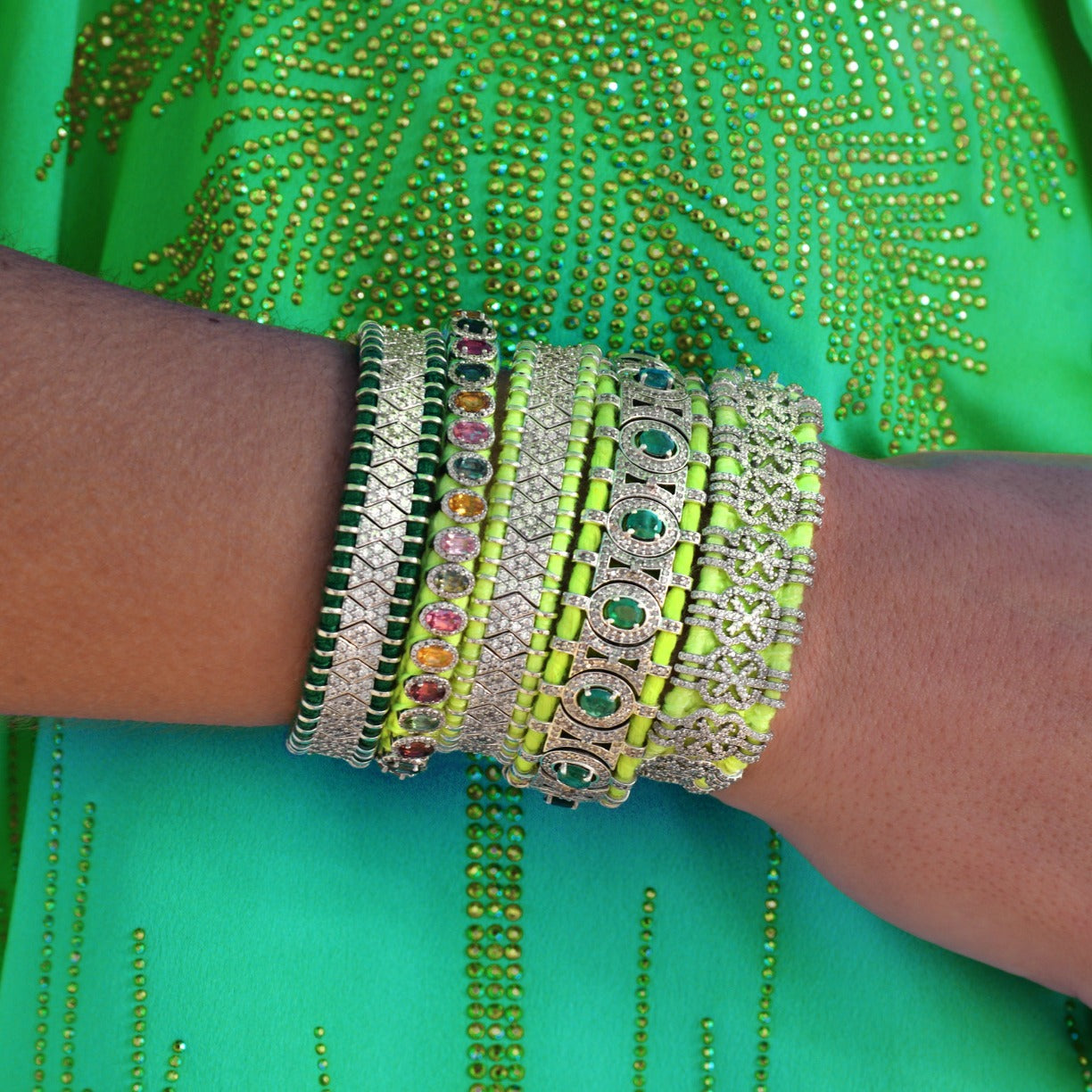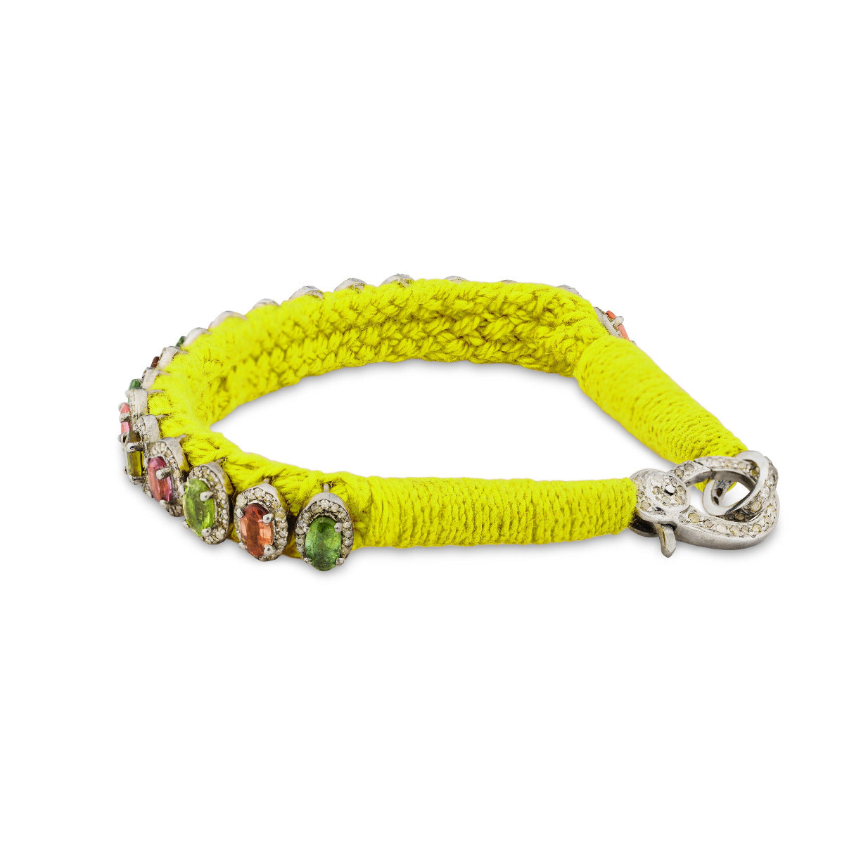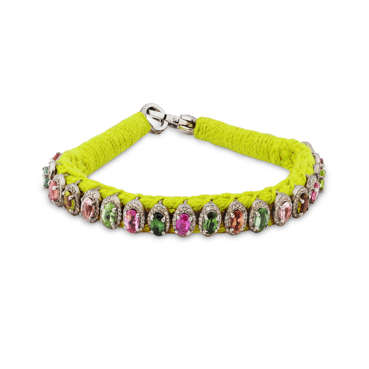 Bracelet in neon yellow braided cotton thread decorated with a 925 silver pattern and set with a multitude of diamonds. It is also decorated with splendid rainbow Tourmalines.