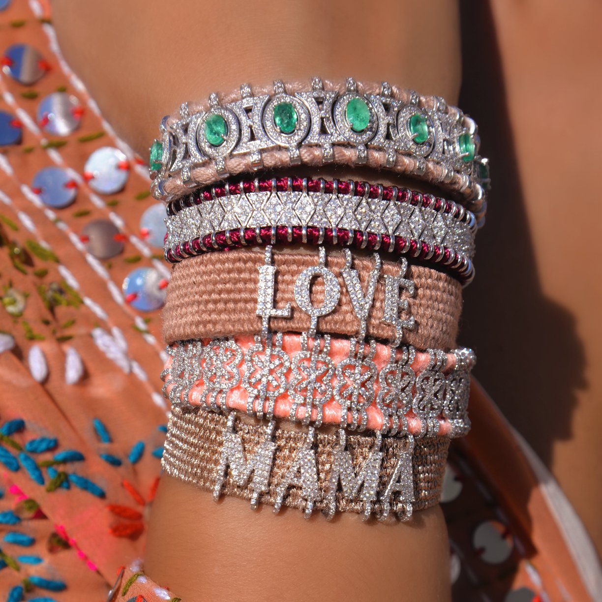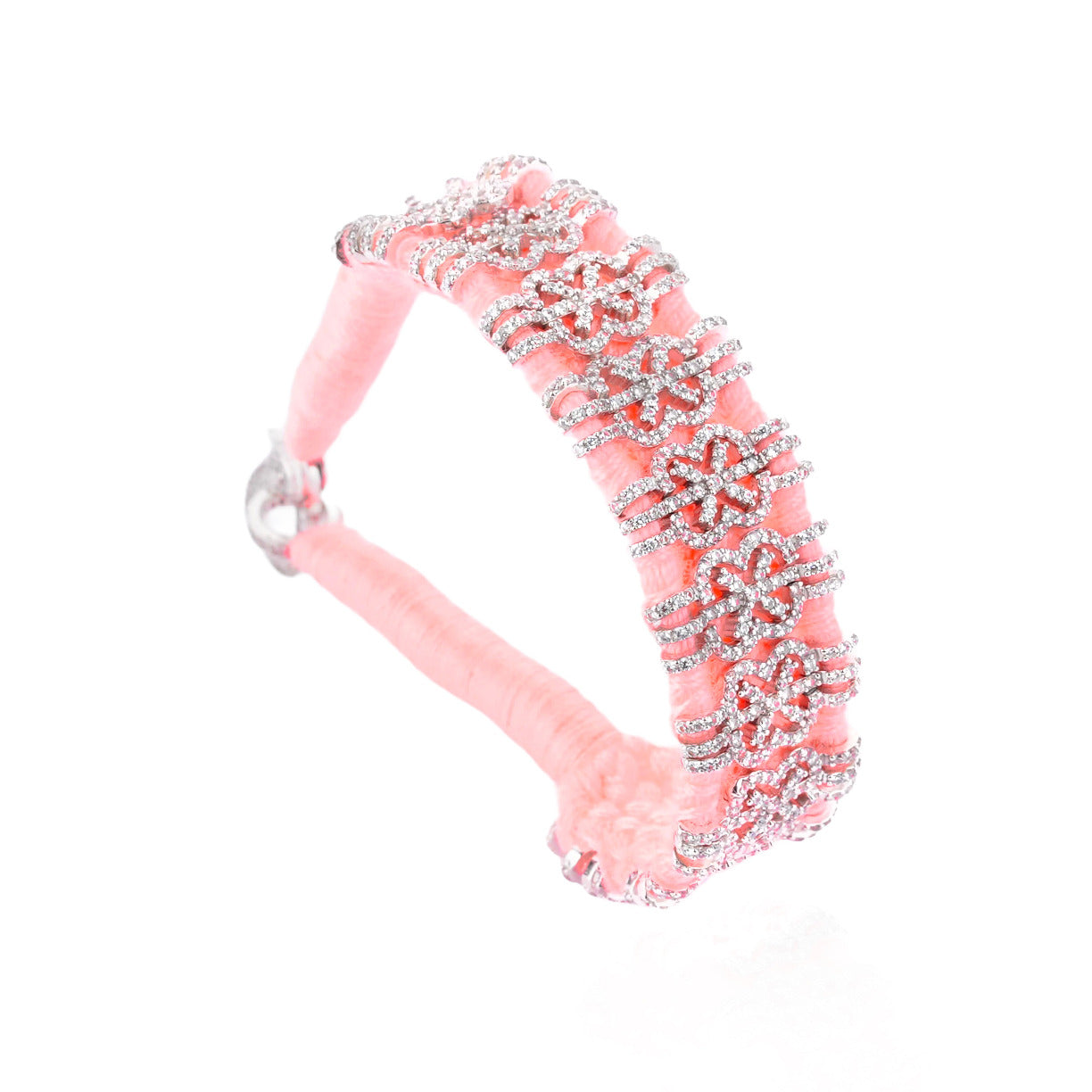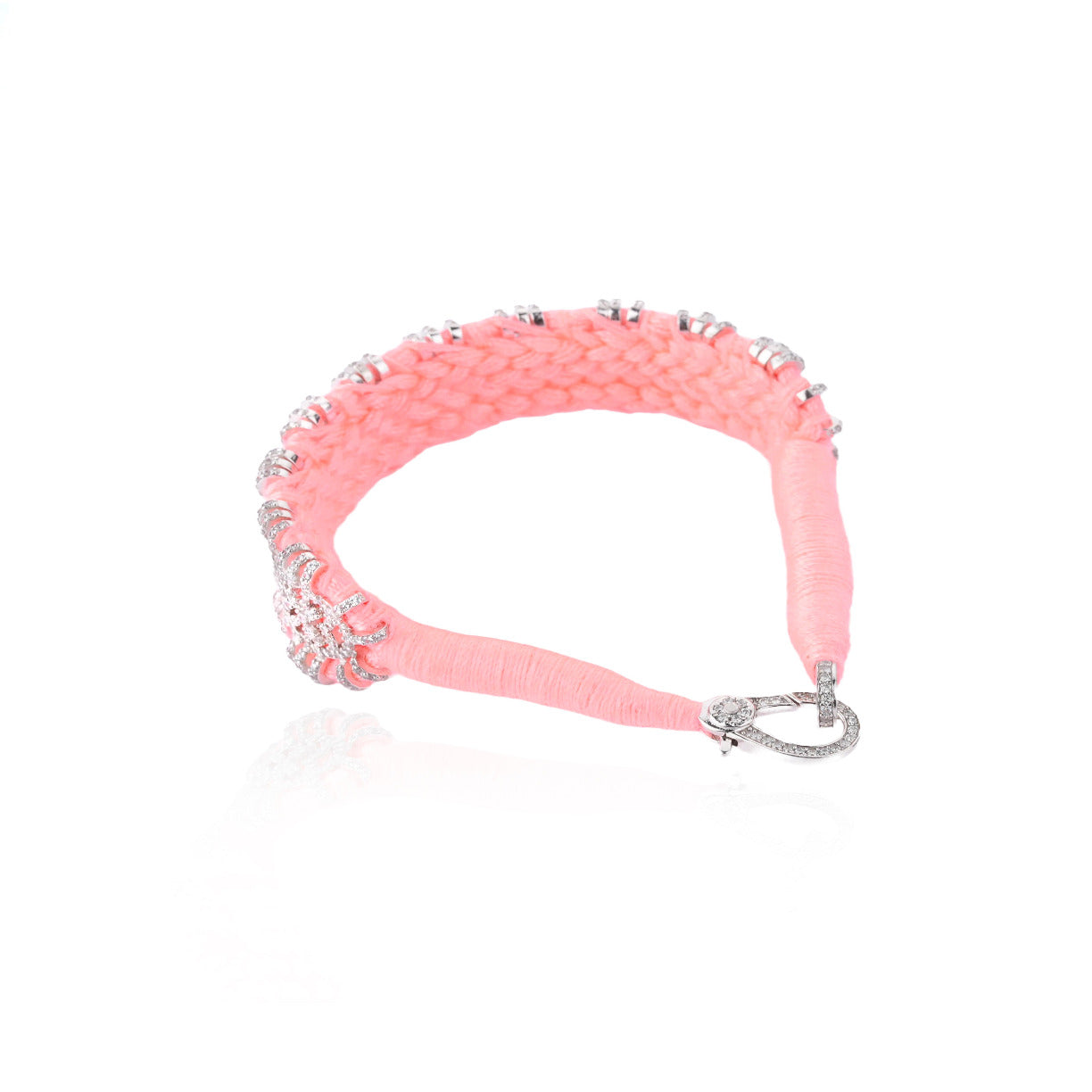 This neon coral pink thread bracelet will be your lucky charm summer bohemian. It is entirely decorated with silver forming a pattern starburst beautifully crafted and set with more than 650 diamonds. This definitely precious looking piece is the friendship bracelet you will love.