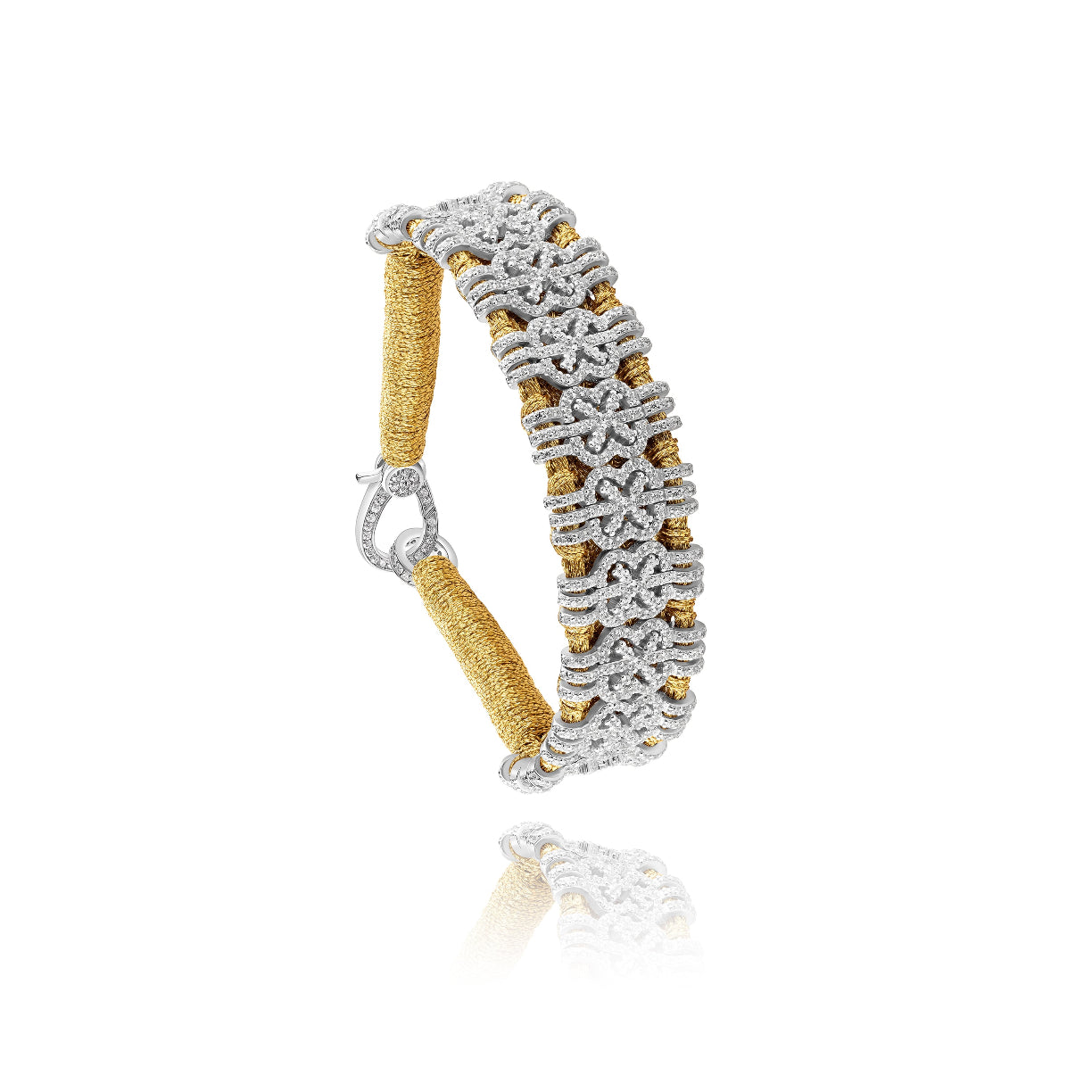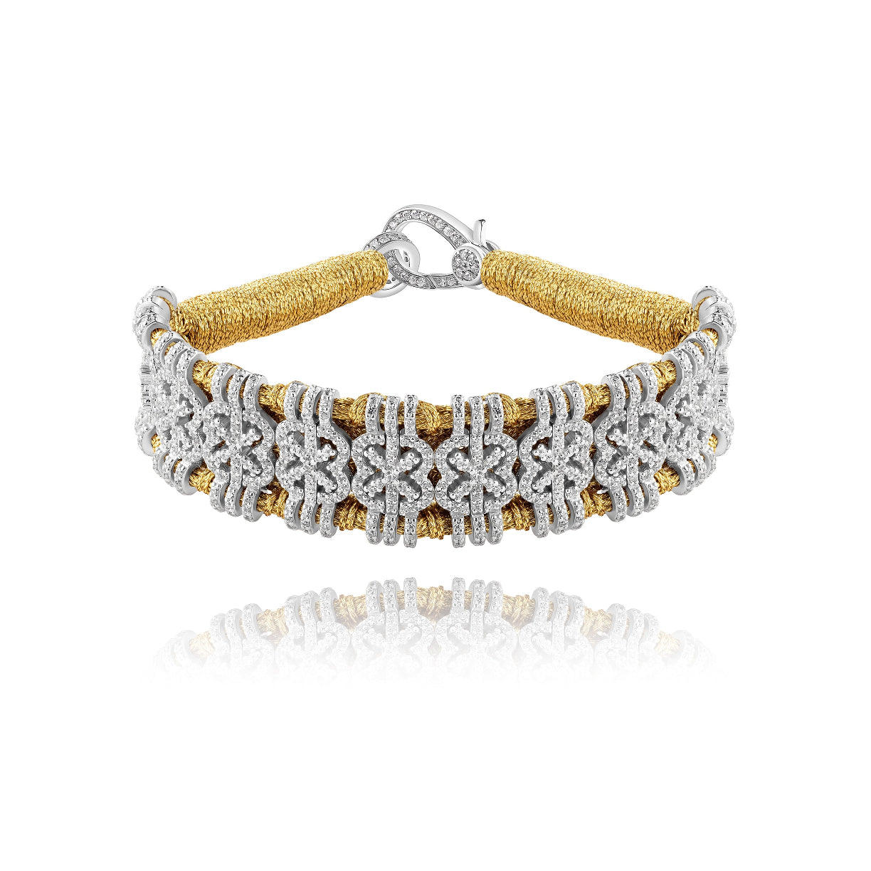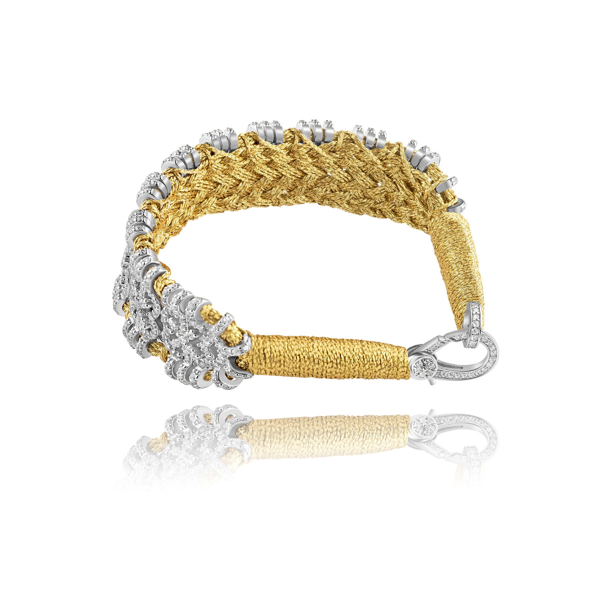 Bracelet in gold-colored braided lurex thread, decorated with a 925 silver motif and set with a multitude of diamonds .