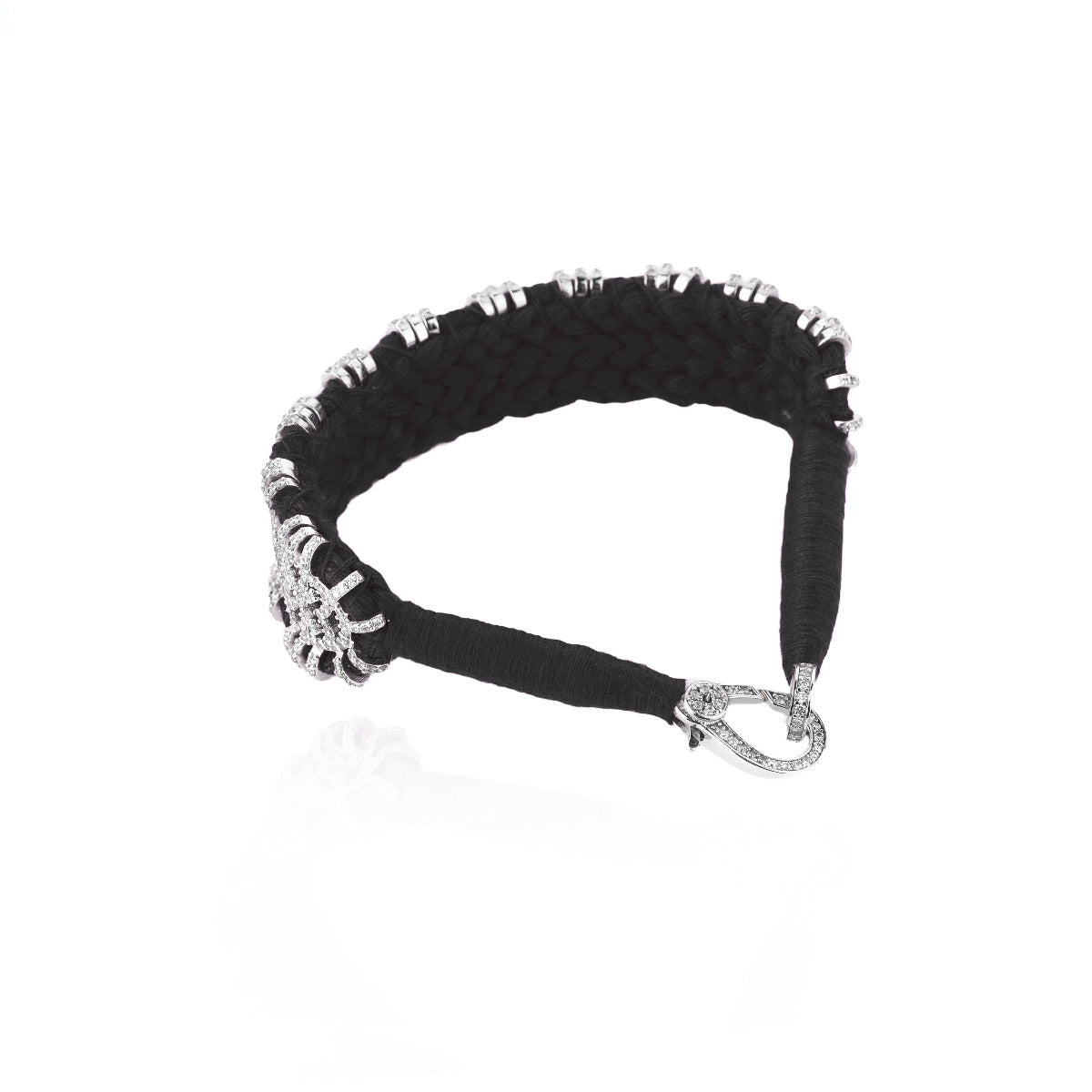 Bracelet in black braided cotton thread, decorated with a 925 silver pattern and set with a multitude of diamonds .