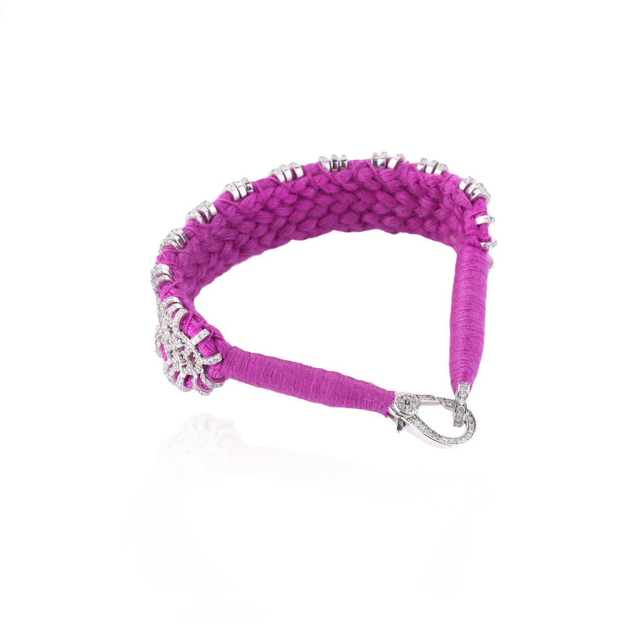 Bracelet in purple braided cotton thread, decorated with a 925 silver pattern and set with a multitude of diamonds .