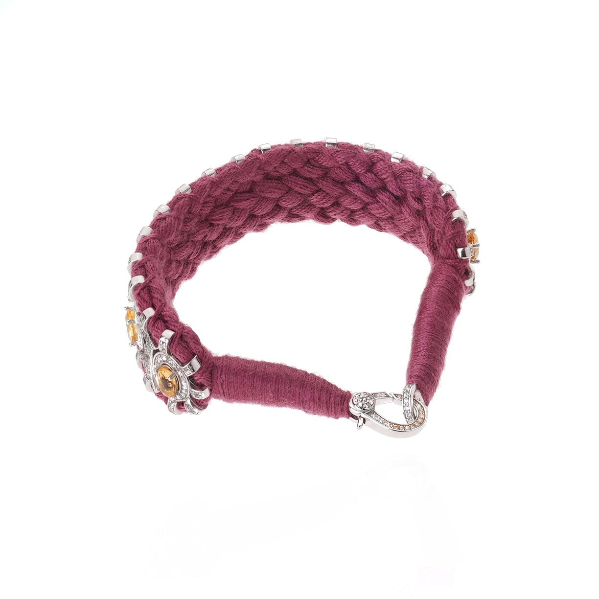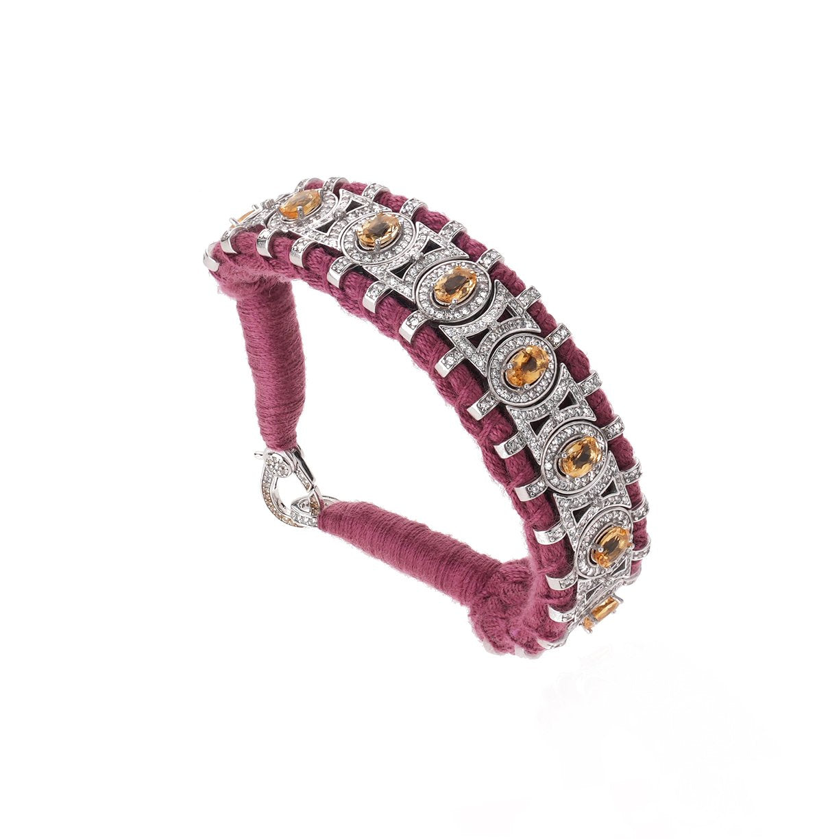 Bracelet in bamboo-colored braided cotton thread, decorated with a 925 silver motif and set with a multitude of diamonds. It is decorated with splendid real citrines.