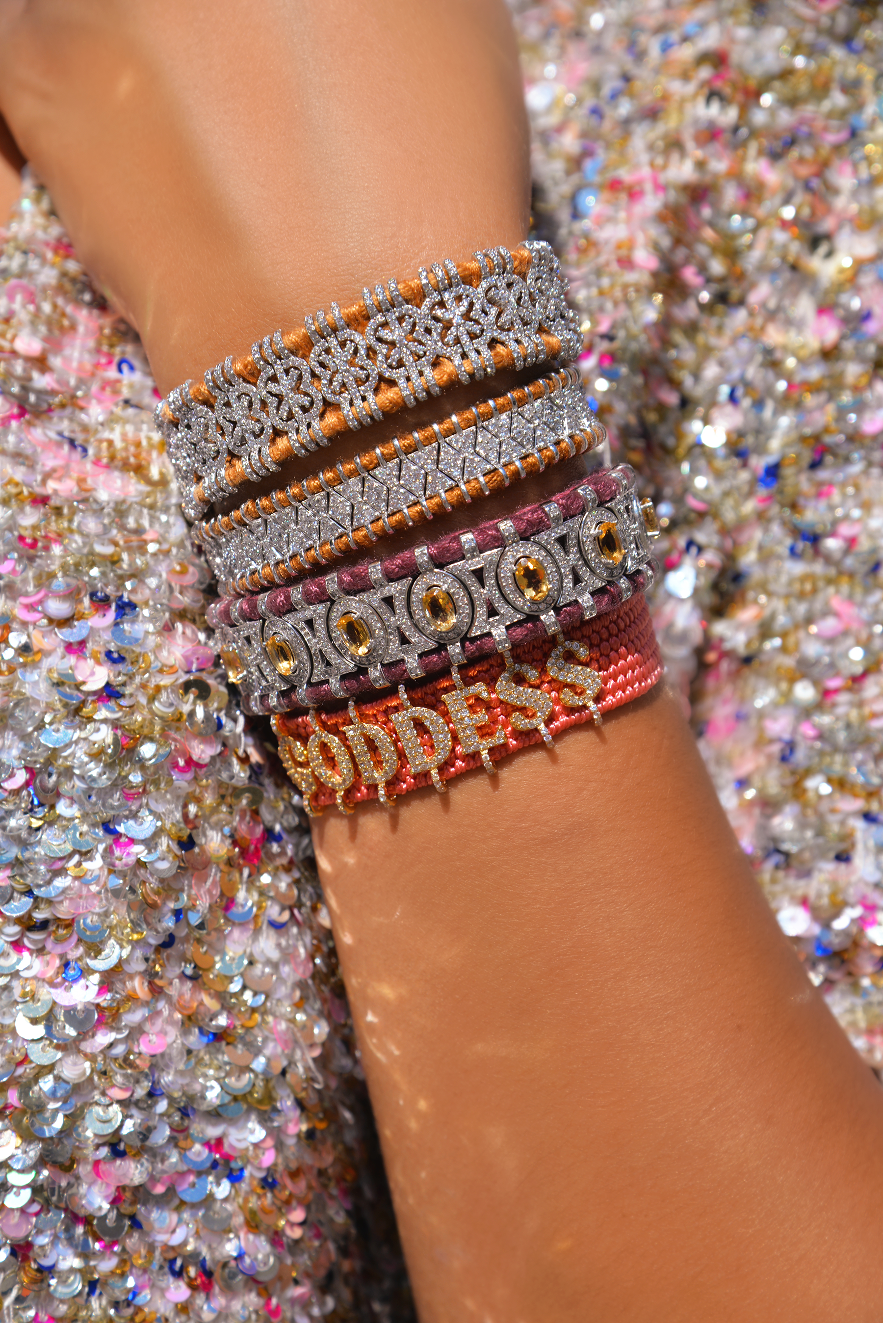 This thread bracelet bamboo color will be your bohemian lucky charm for the summer. It is entirely decorated with silver forming an oval pattern set with more than 300 diamonds. Each small oval is beautifully decorated with a central citrine. It will forever be your friendship bracelet with its precious style and will never leave your wrist.