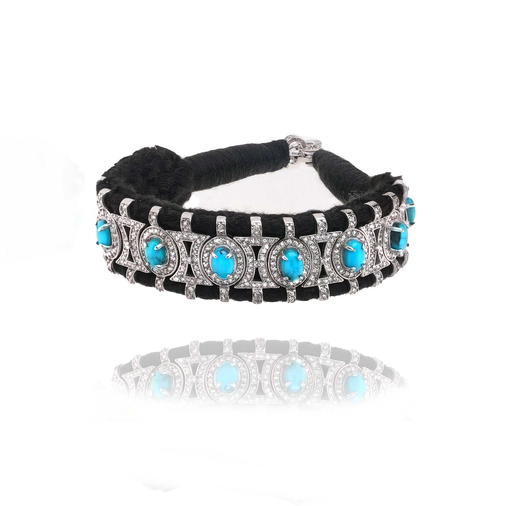 This thread bracelet black color will be your bohemian lucky charm for the summer. It is entirely decorated with silver forming an oval pattern set with more than 300 diamonds. Each small oval is beautifully decorated with a central turquoise. It will forever be your friendship bracelet with its precious style and will never leave your wrist.