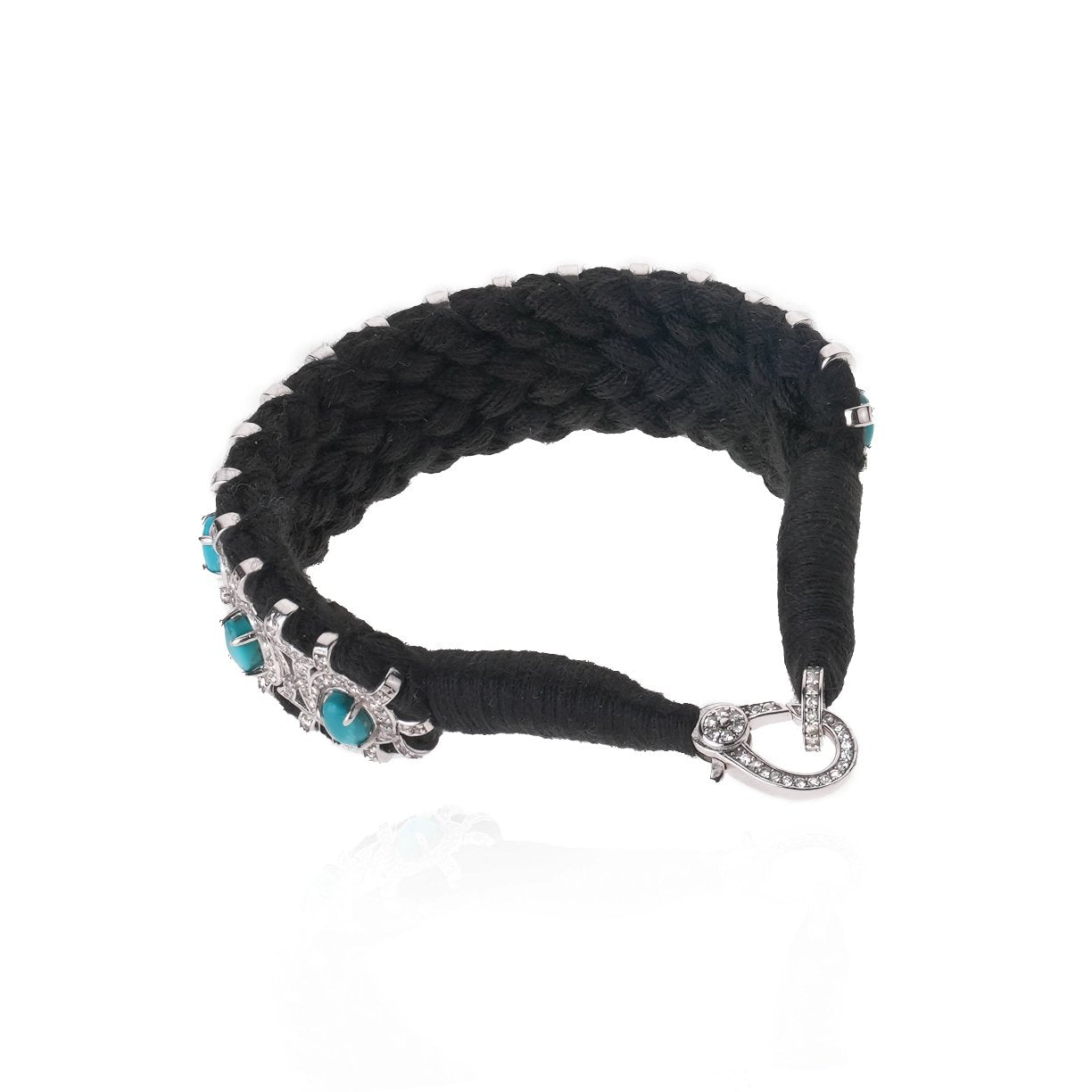 Bracelet in black braided cotton thread, decorated with a 925 silver pattern and set with a multitude of diamonds . It is decorated with splendid real turquoises.