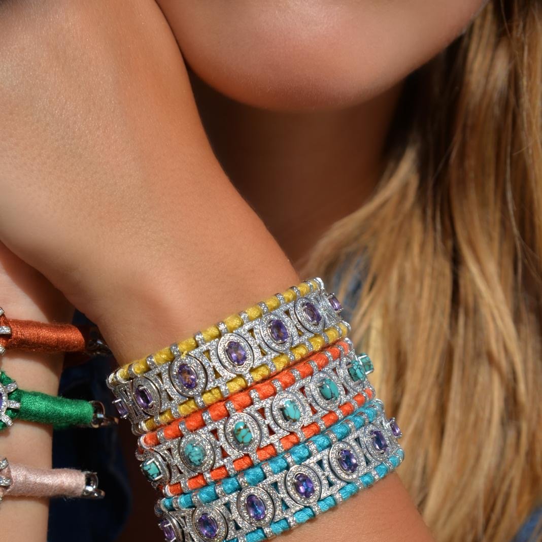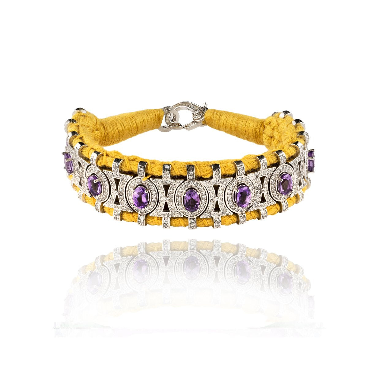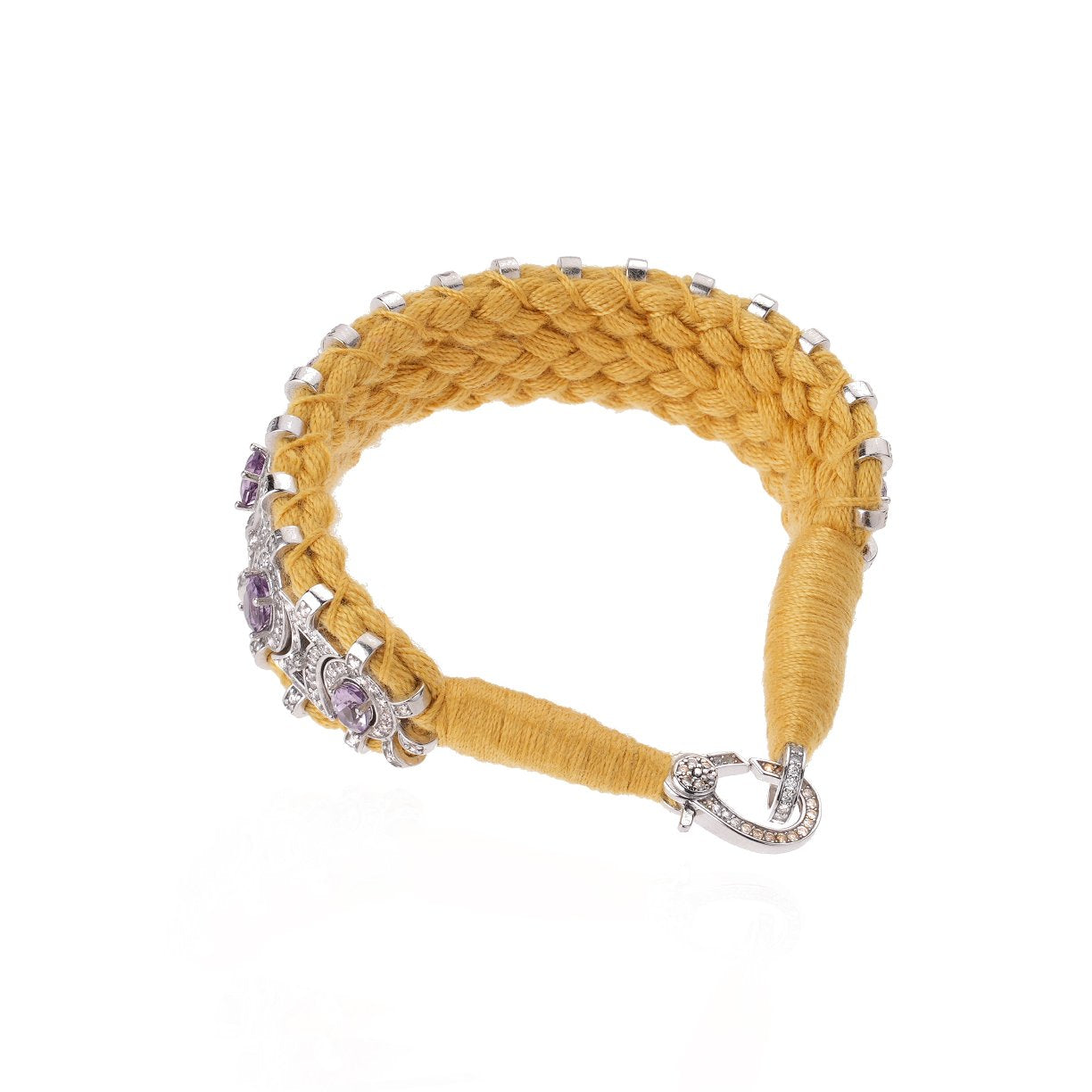 This thread bracelet saffron color will be your bohemian lucky charm for the summer. It is entirely decorated with silver forming an oval pattern set with more than 300 diamonds. Each small oval is beautifully decorated with a central Amethyst. It will forever be your friendship bracelet with its precious style and will never leave your wrist.