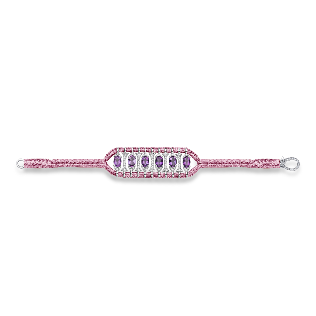Bracelet in baby color braided lurex thread decorated with a motif in silver 925 entirely paved with moissanites and enhanced with Amethysts.