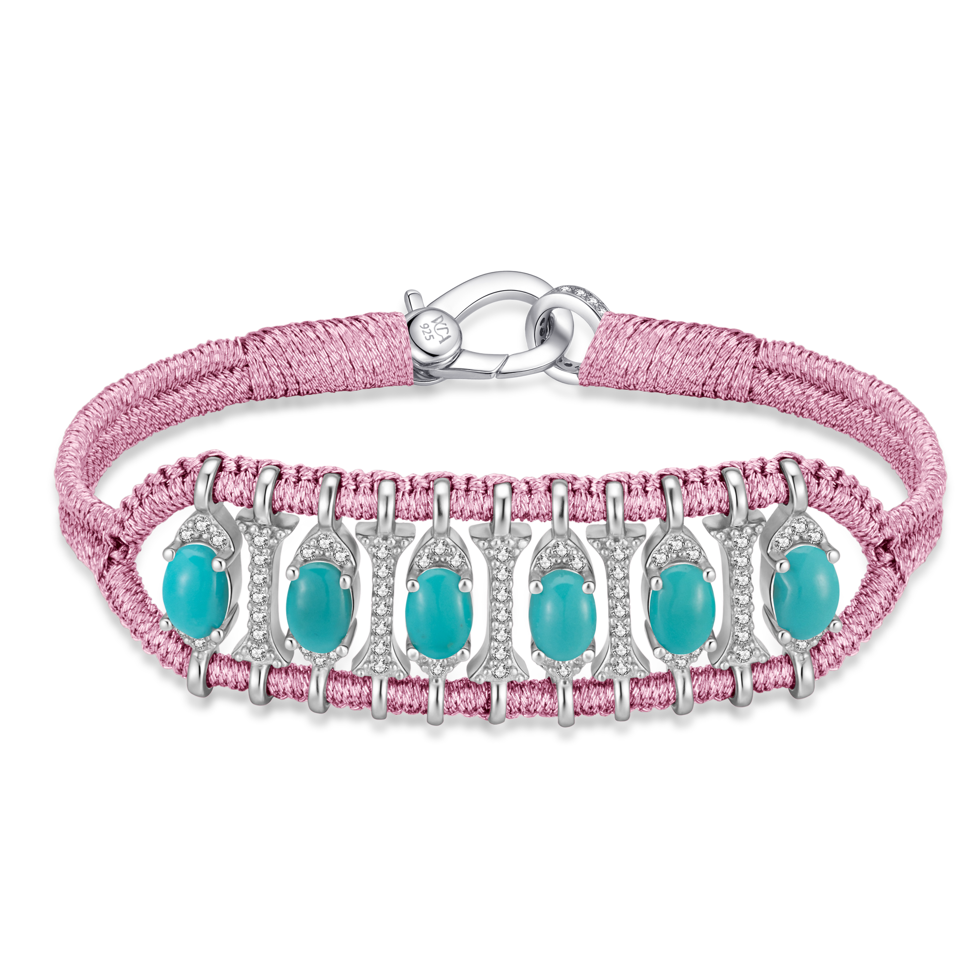 Bracelet in baby lurex thread decorated with a motif in silver 925 entirely paved with moissanites and enhanced with Turquoises.