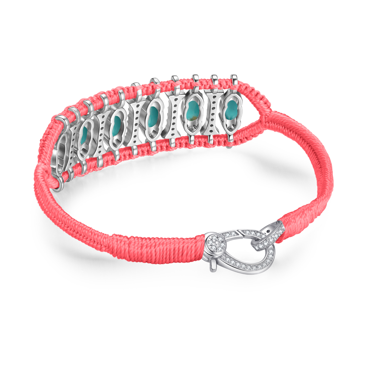 Bracelet in cheeks braided cotton thread decorated with a motif in silver 925 entirely paved with moissanites and enhanced with Turquoises.