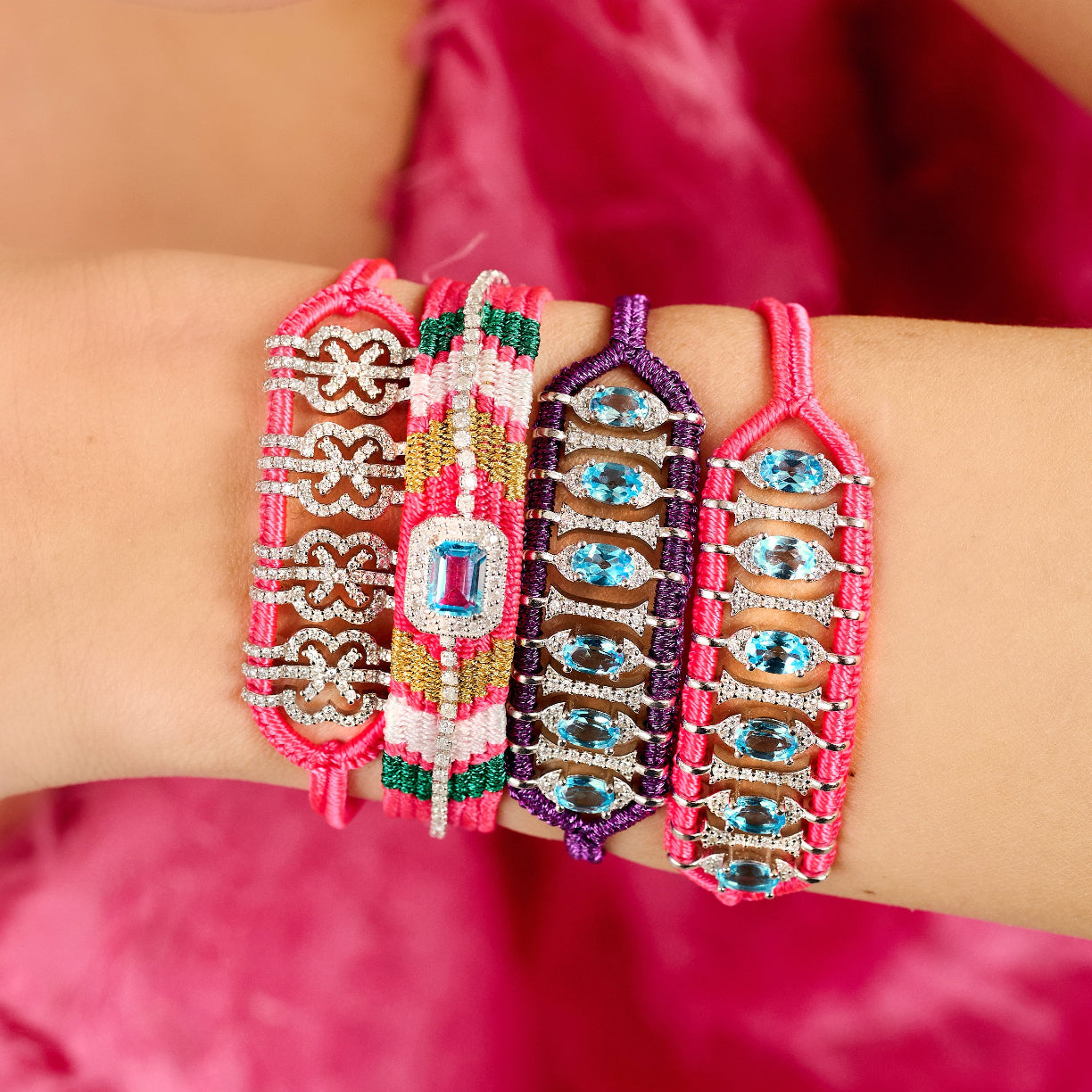 Bracelet in Iris purple lurex thread decorated with a motif in silver 925 entirely paved with moissanites and enhanced with blue Swiss topazes.
