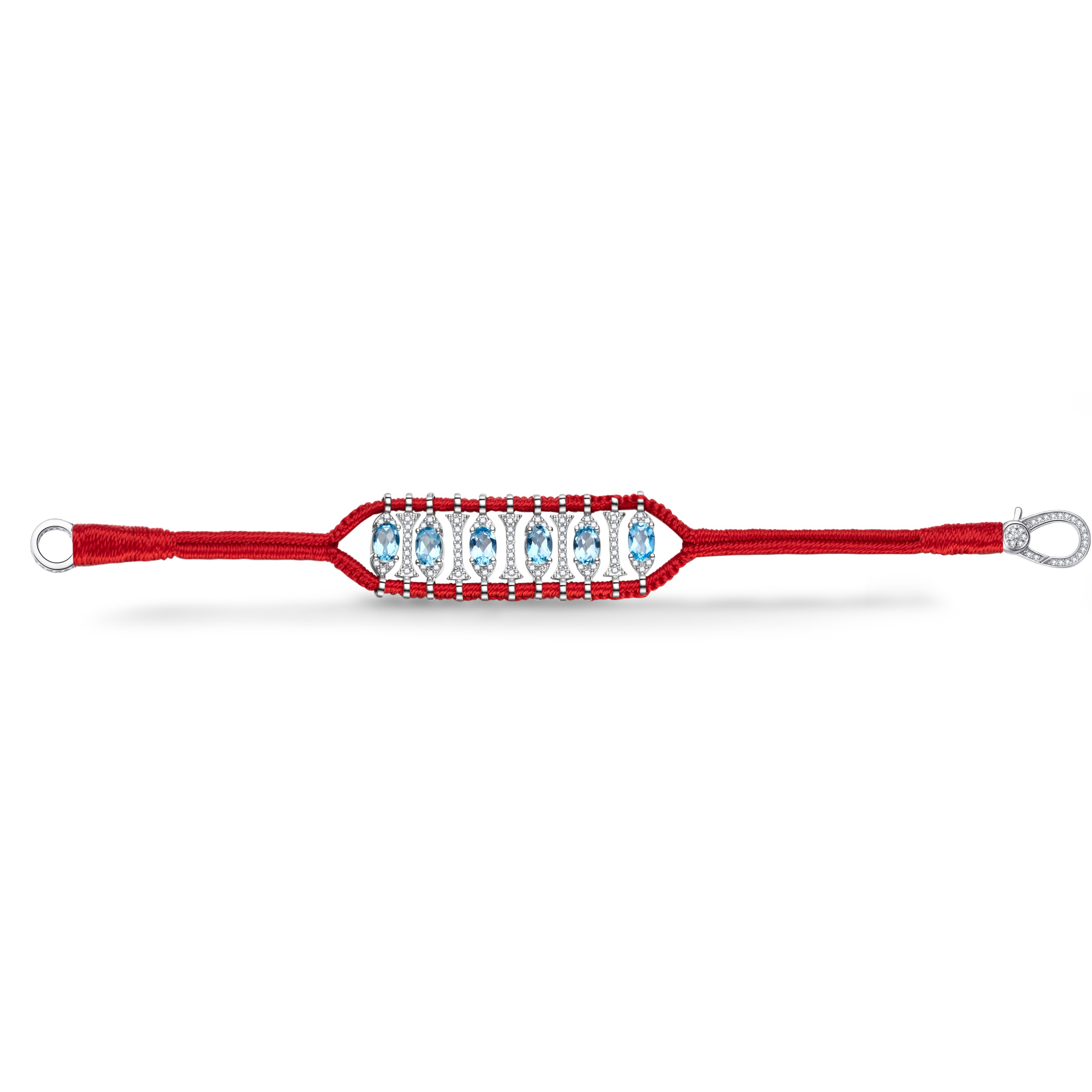 Bracelet in red color cotton thread decorated with a motif in silver 925 entirely paved with moissanites and enhanced with blue Swiss topazes.
