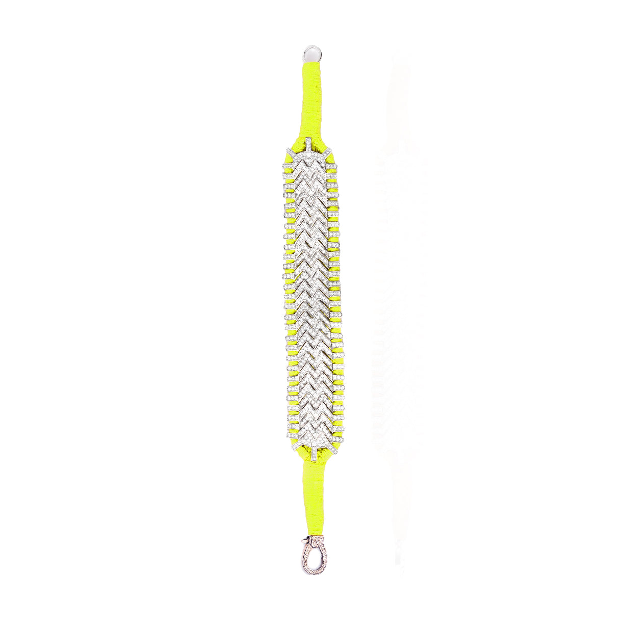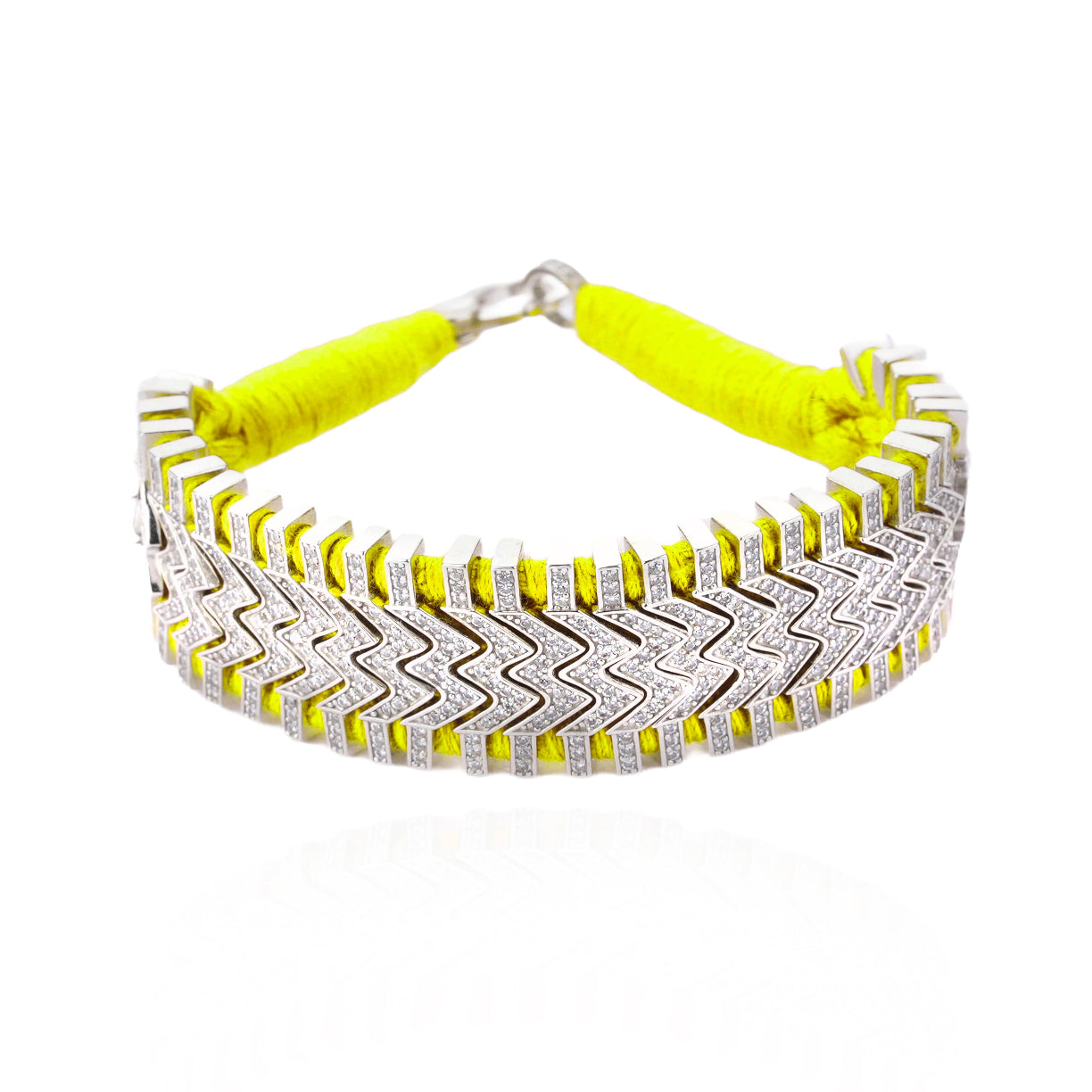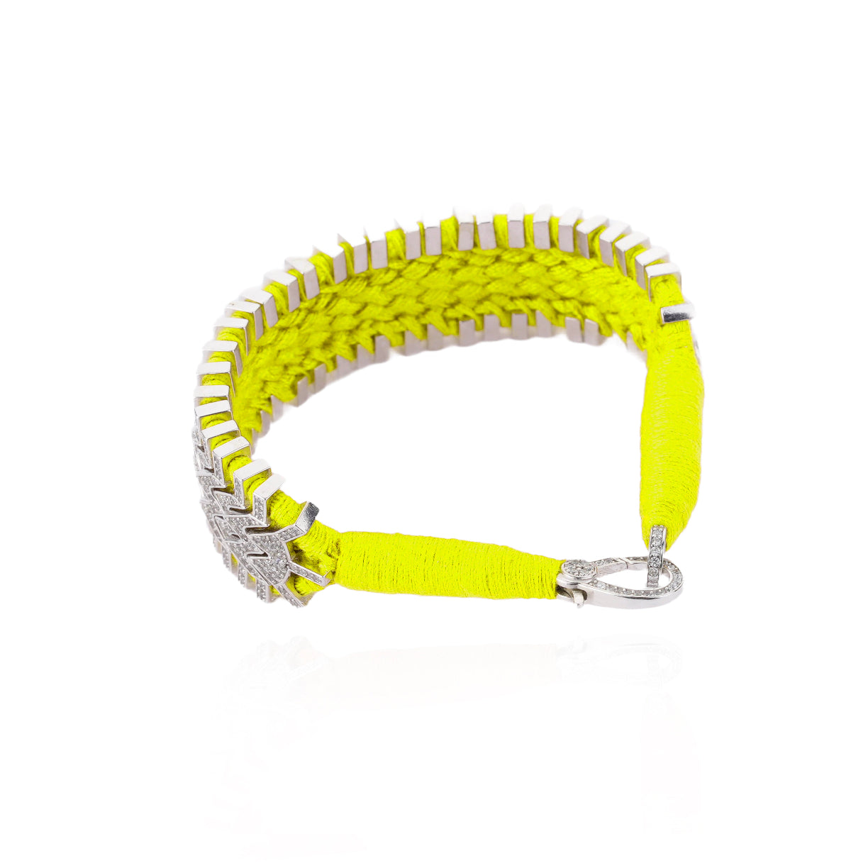 Bracelet in neon yellow braided cotton thread decorated with a 925 silver pattern and set with a multitude of diamonds.