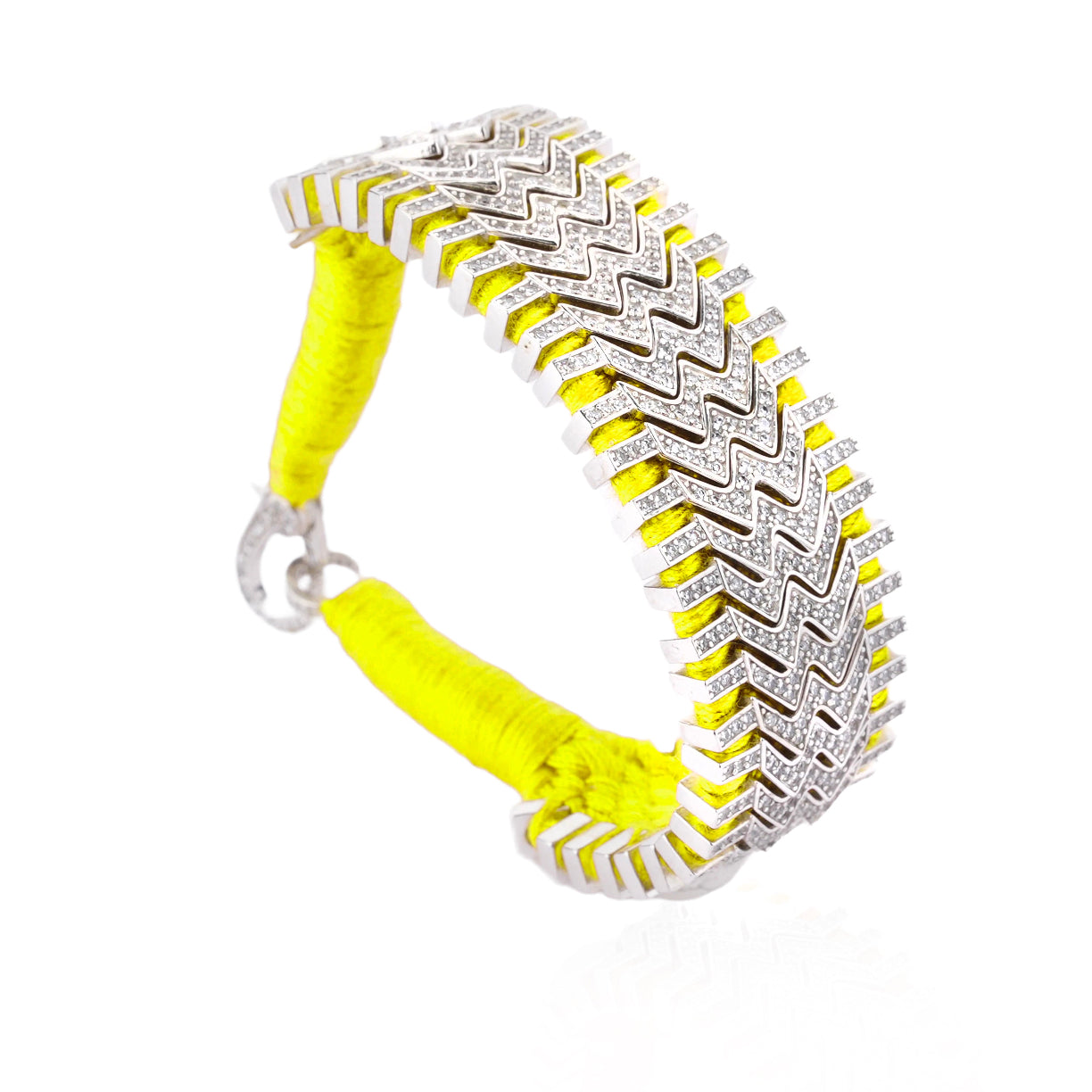 This sublime bracelet made of yellow thread and decorated with a double chevron silver pattern, itself set with more than 400 diamonds.