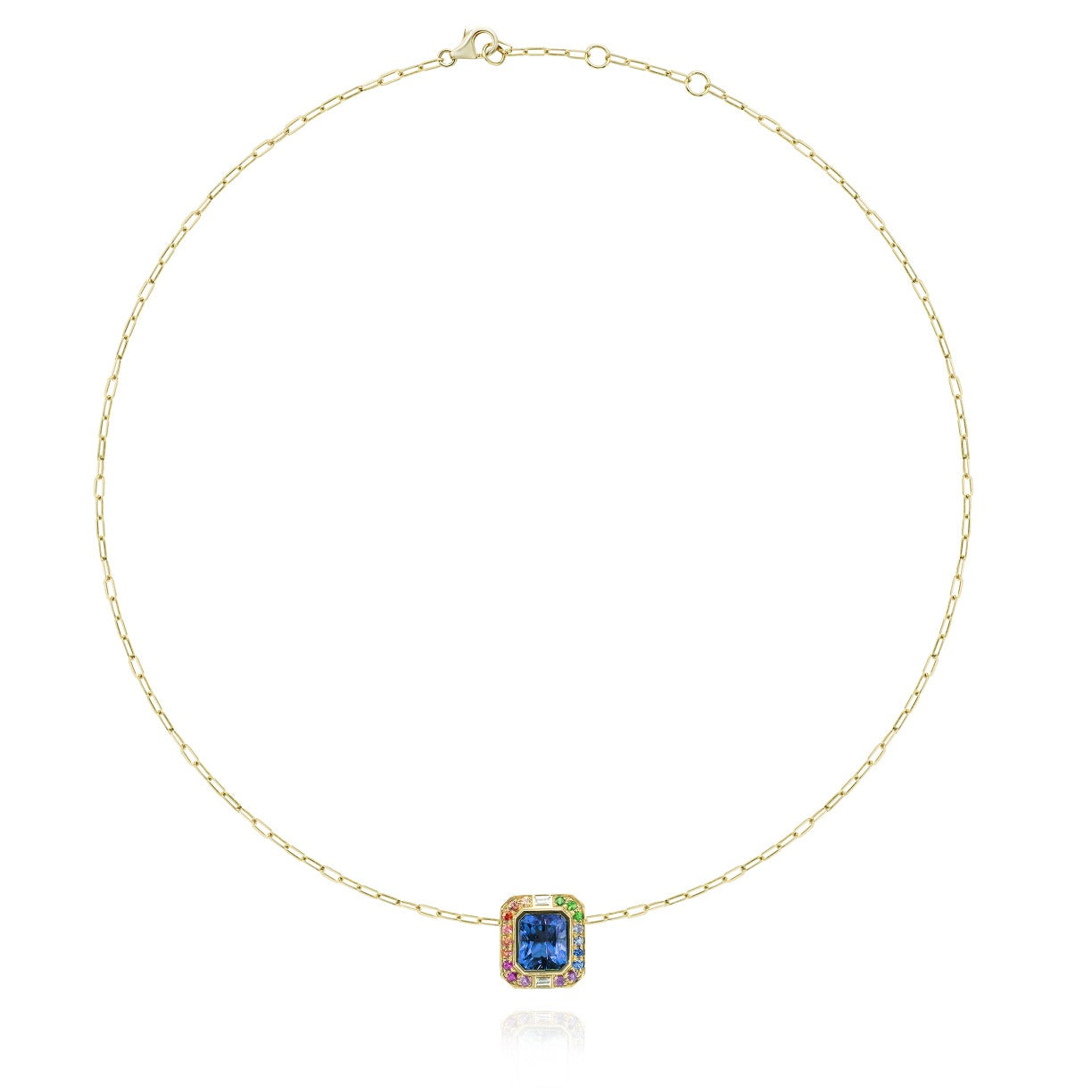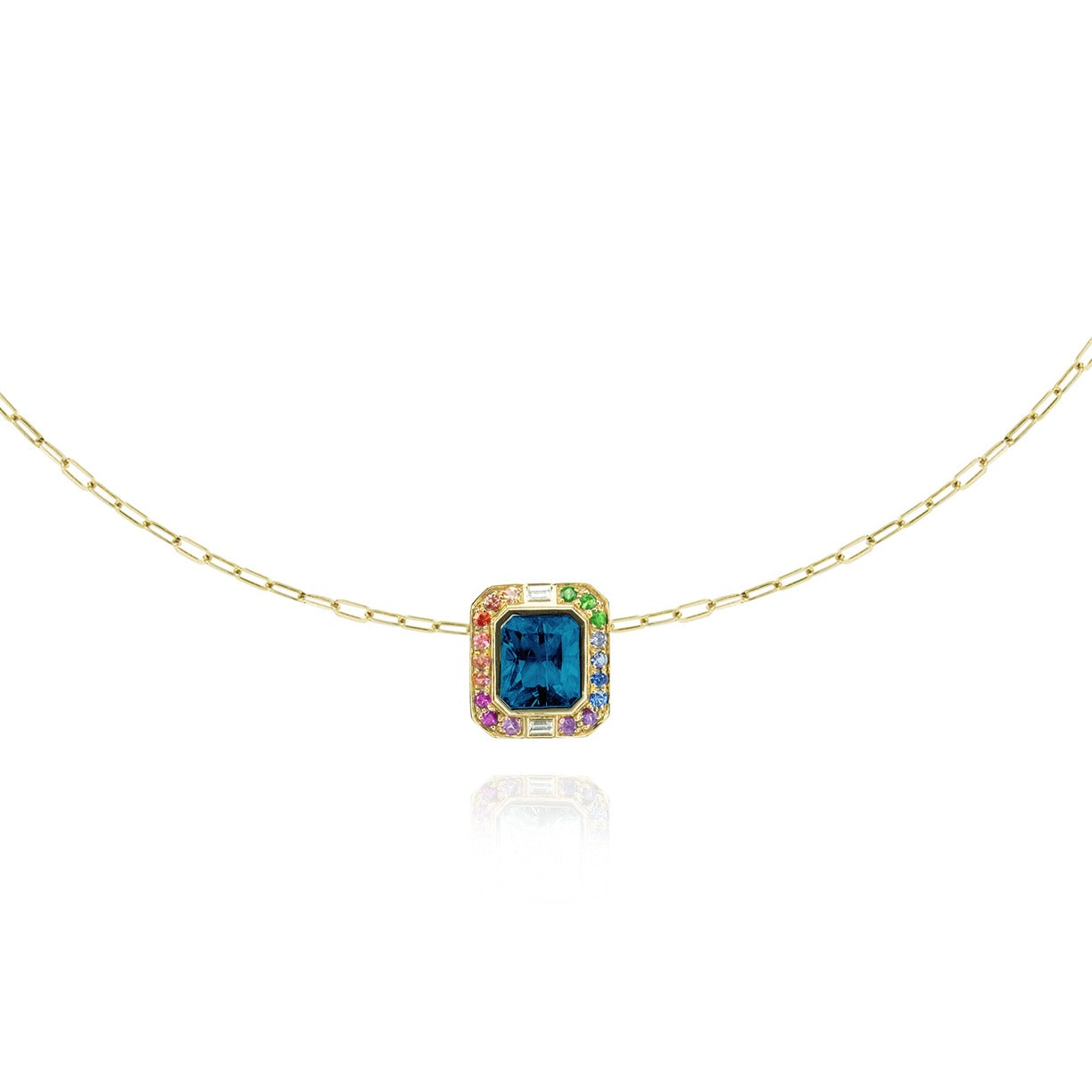 Art deco inspired necklace in 18-carat yellow gold adorned with a pendant with an emerald-cut sky blue topaz set with sixteen rainbow gradient stones and two baguette zircons .