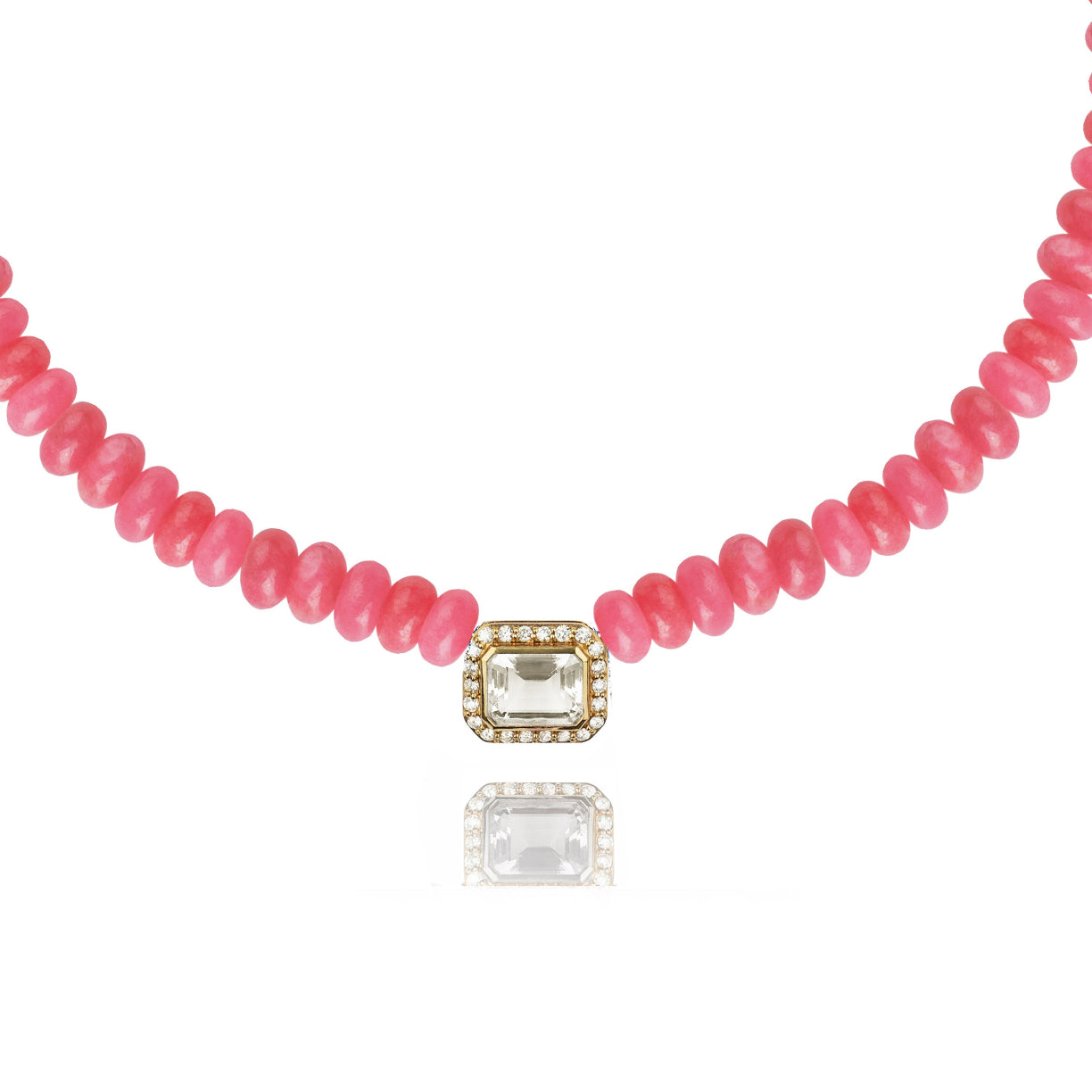 Pink quartz stone bead choker necklace, adorned with a central cabochon with a Crystal quartz and set with sparkling diamonds .