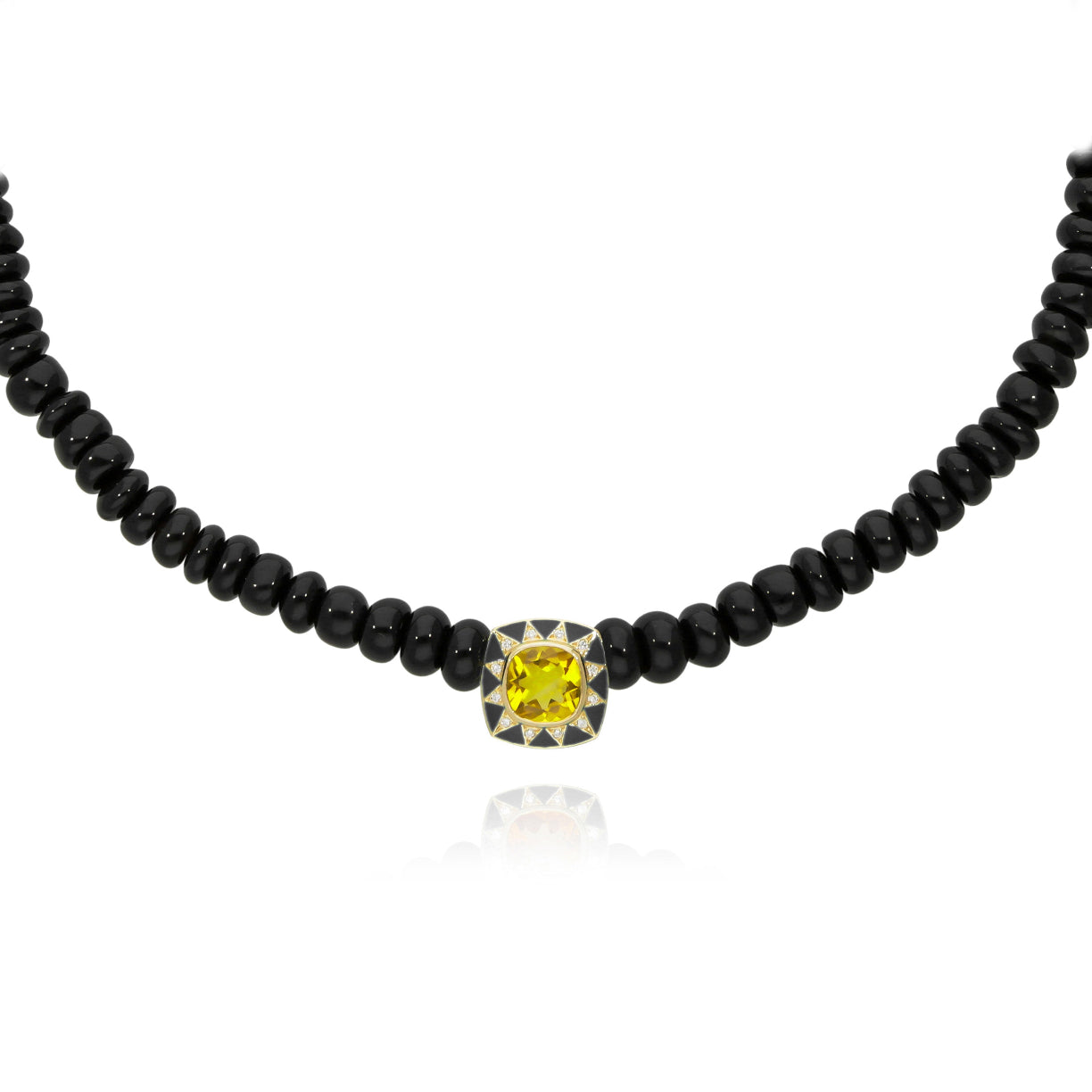 This necklace in black onyx stones mounted in cascade mixes singularity and panache. In its center a yellow gold cabochon 18 carats represents a star. Heavenly and mysterious, this medal with a lemon quartz, sparkles with a thousand lights by its diamonds and its black enamel.