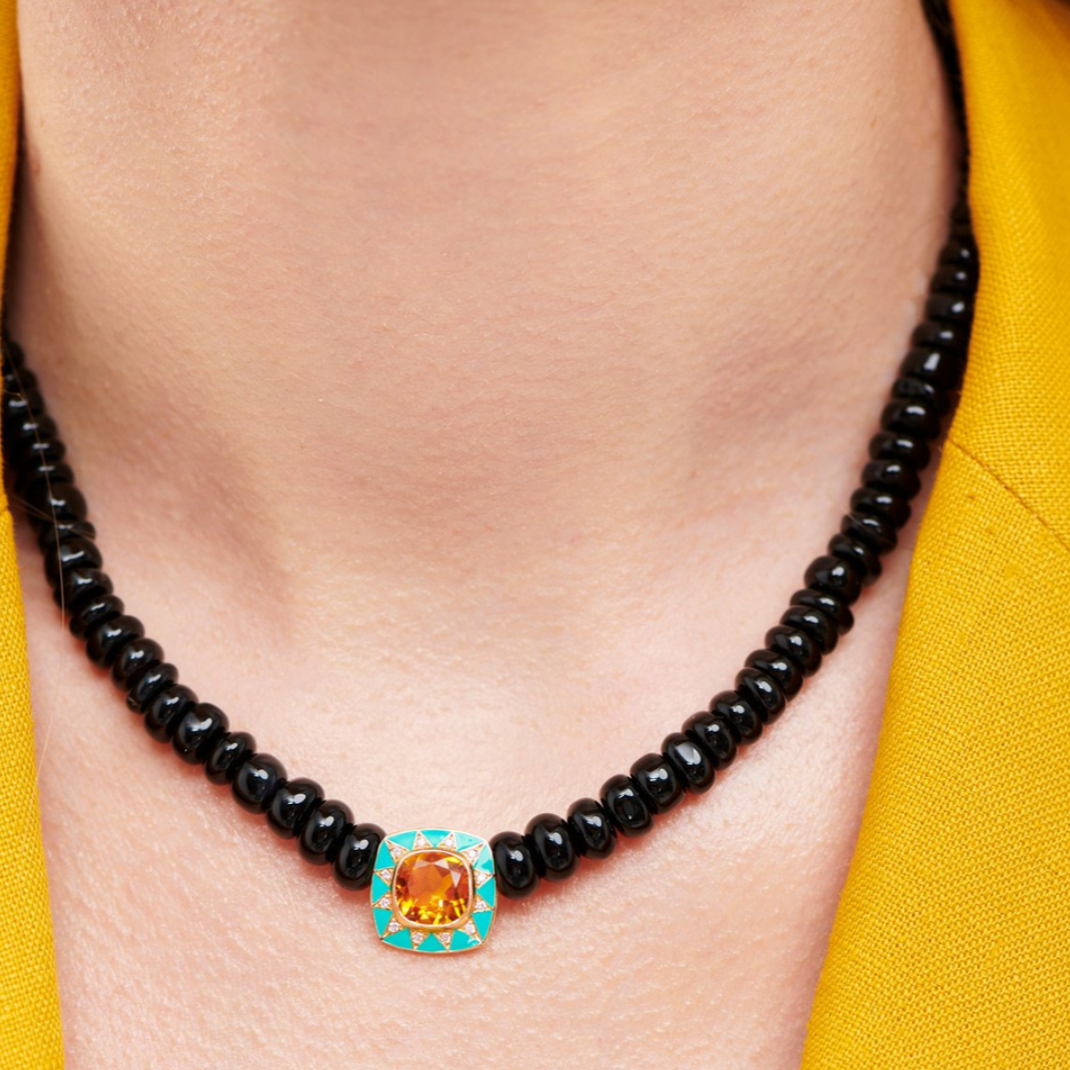 This necklace black onyx stones cascading climbs mix singularity and panache. In its center a cabochon in 18k yellow gold represents a star. Celestial and mysterious, this medal with a citrine, sparkles with a thousand lights with its diamonds and its turquoise blue enamel.