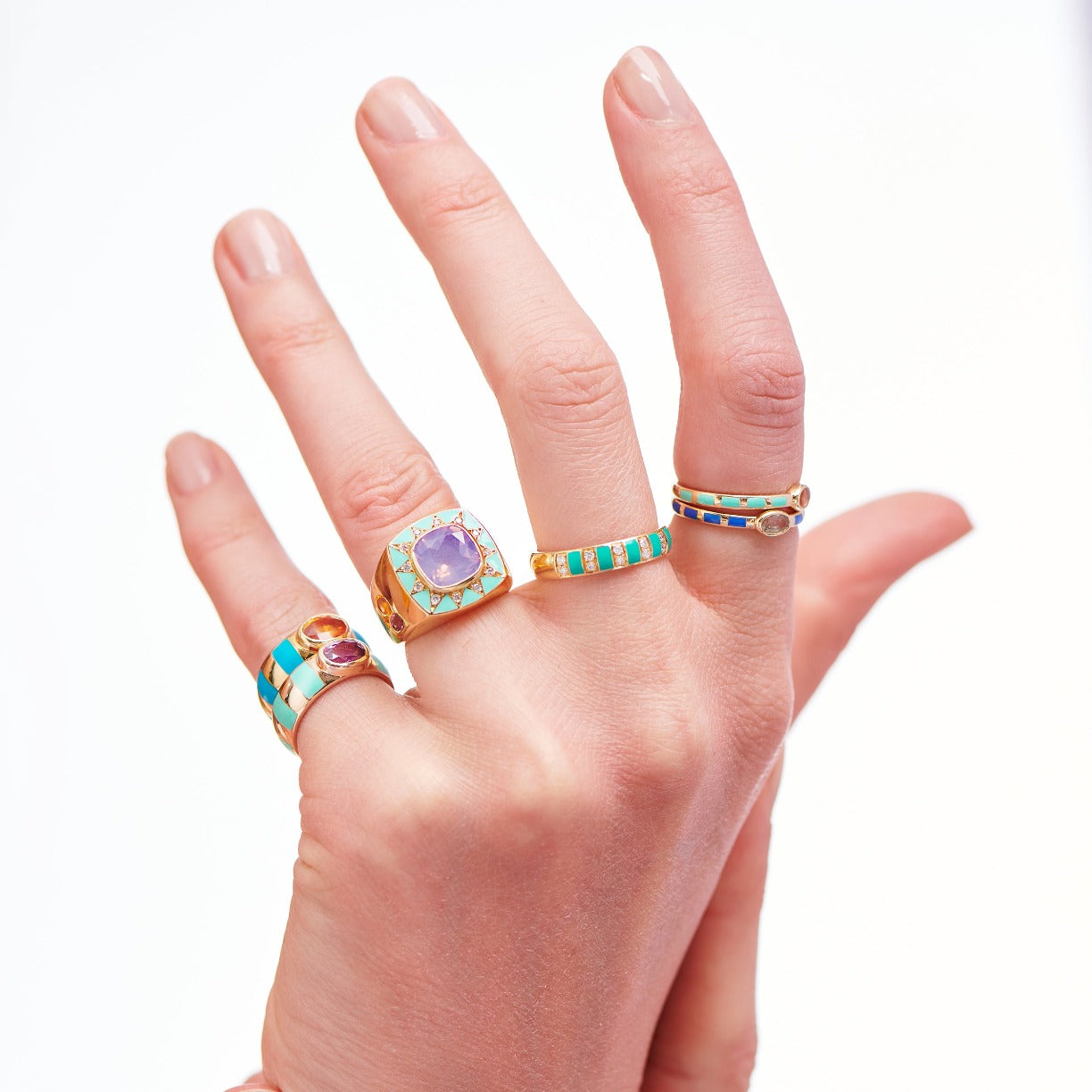 Water green enamel, 18k Gold, lavender quartz and diamonds