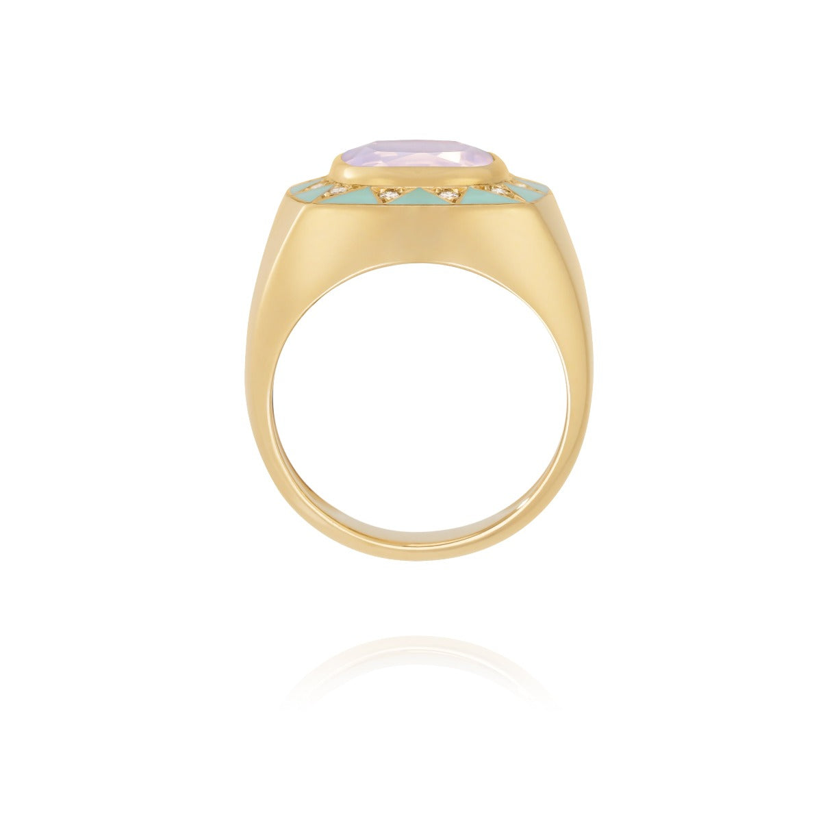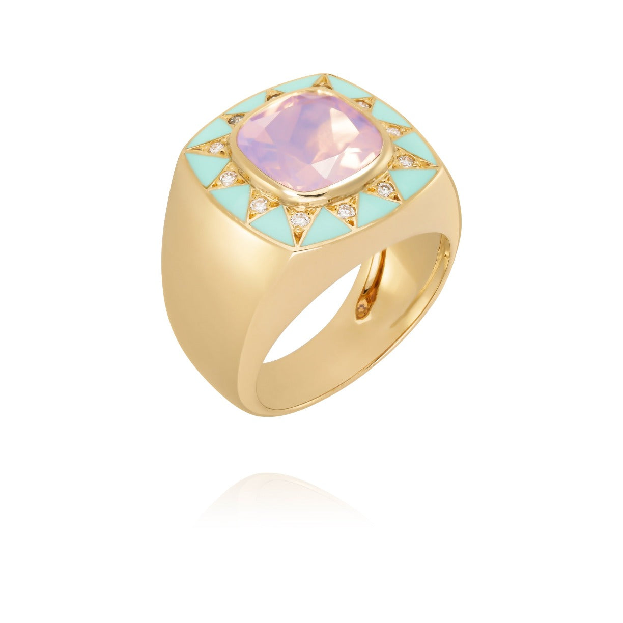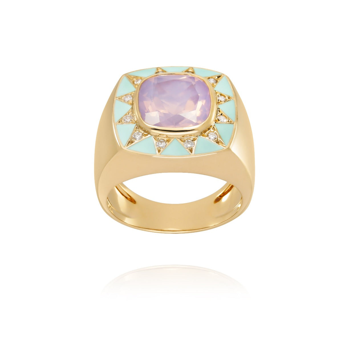 18-carat gold ring in the shape of a bangle or imposing signet ring, adorned in its center with a lavender-colored Quartz radiating like a star decorated with diamonds set in a triangle and sea green enamel .