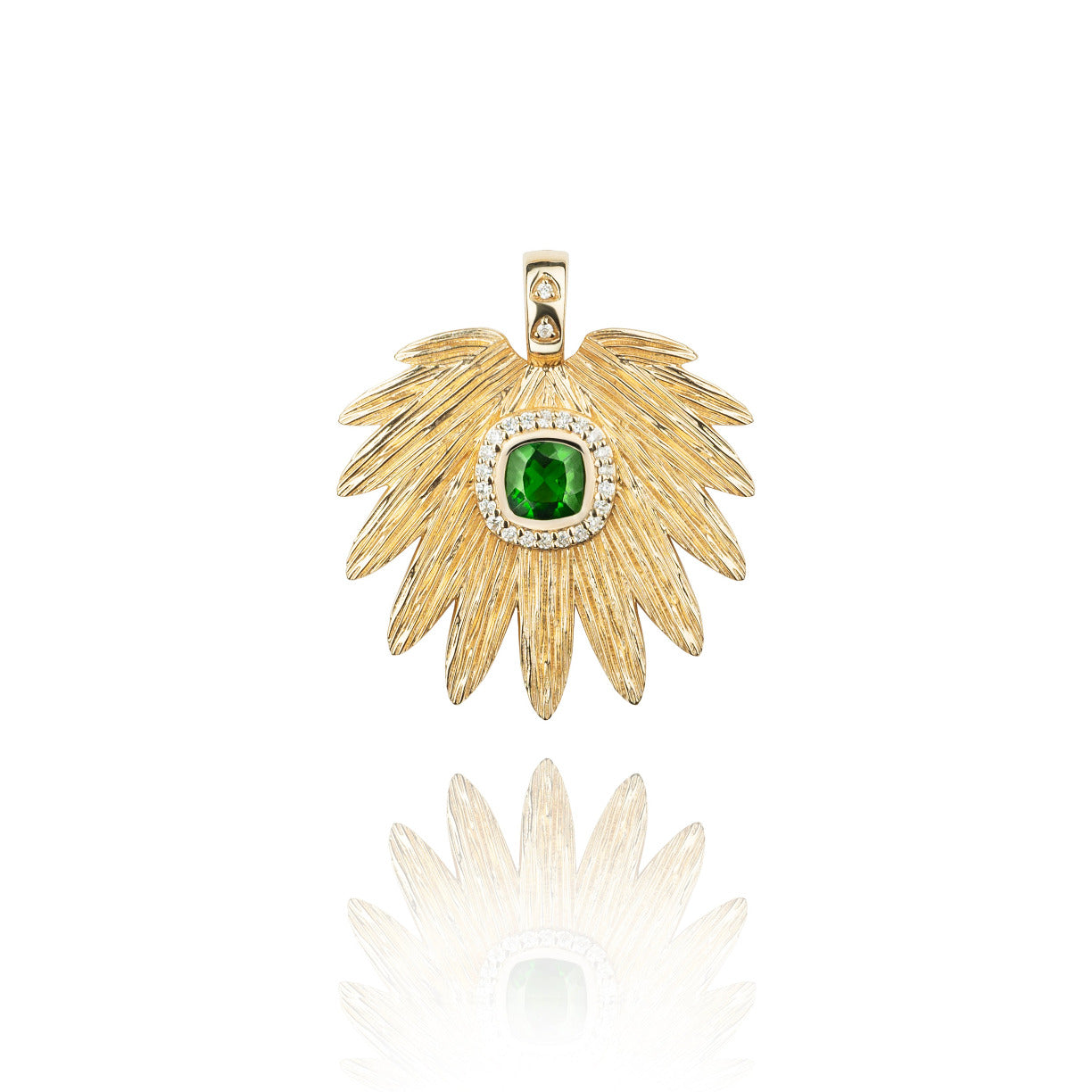 Hand-hammered 14k gold pendant adorned with a Diopside surrounded by diamonds and two diamonds on the bail.