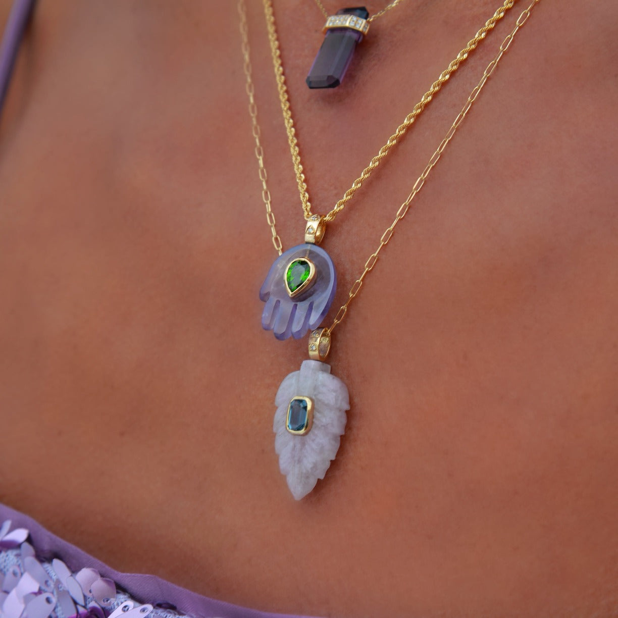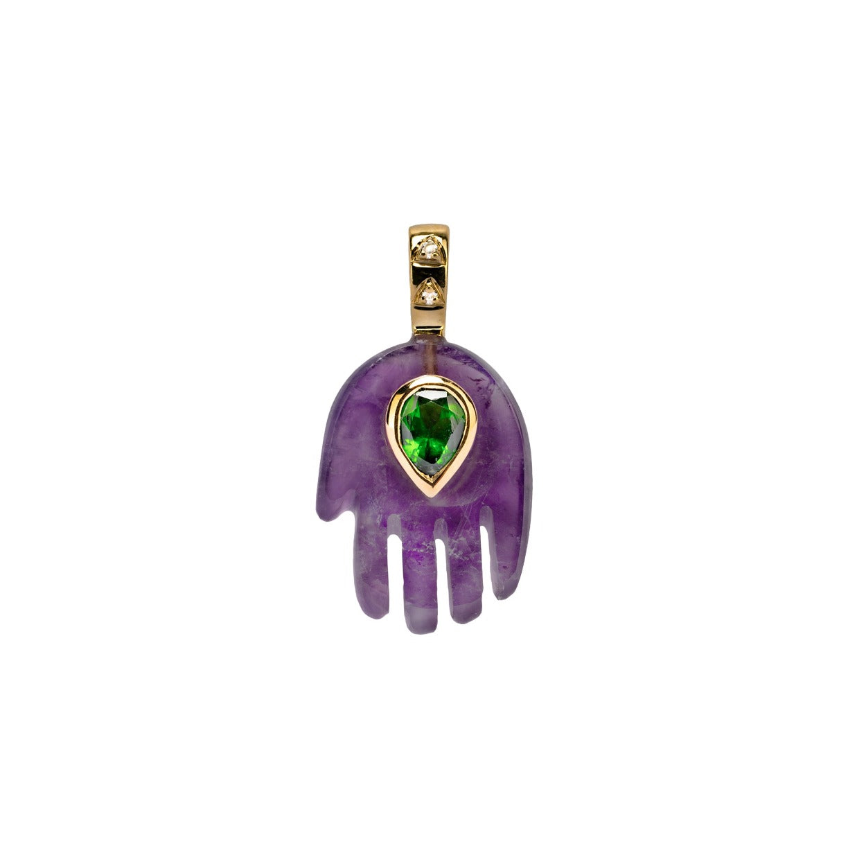 Lovely pendant in Amethyst representing a delicate hand. This pendant is carved from the stone using the carving technique. This hand is subtly set in its center with a precious Diopside pear size. The hand is a symbol present in many religions but is also a pagan symbol which represents protection. This pendant can be worn on a thin or thicker chain thanks to its 14-carat gold bail decorated with two small diamonds, which is wide enough to allow links of 3mm in diameter to pass through. Why not also wear this magnificent jewelry on a hoop for a 100% fashion look.