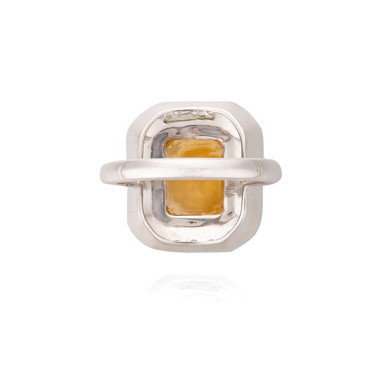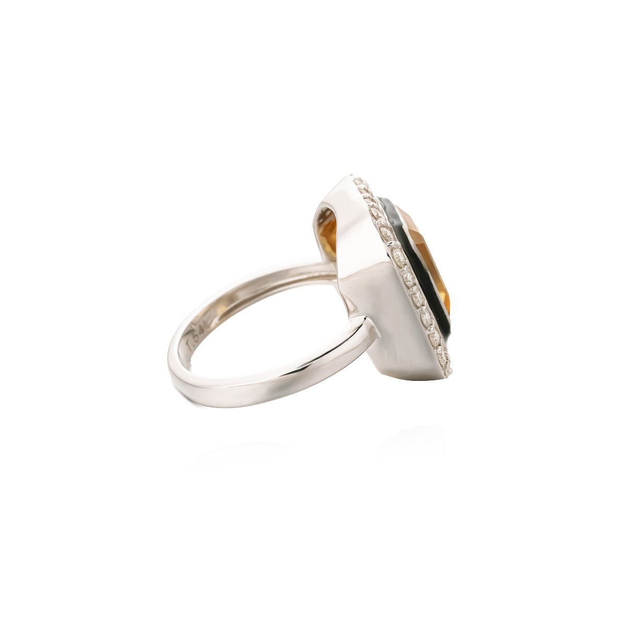 Bague d'inspiration art déco en argent 925 ornée d'une Citrine taille émeraude, sertie de diamants et rehaussée d'émail noir.