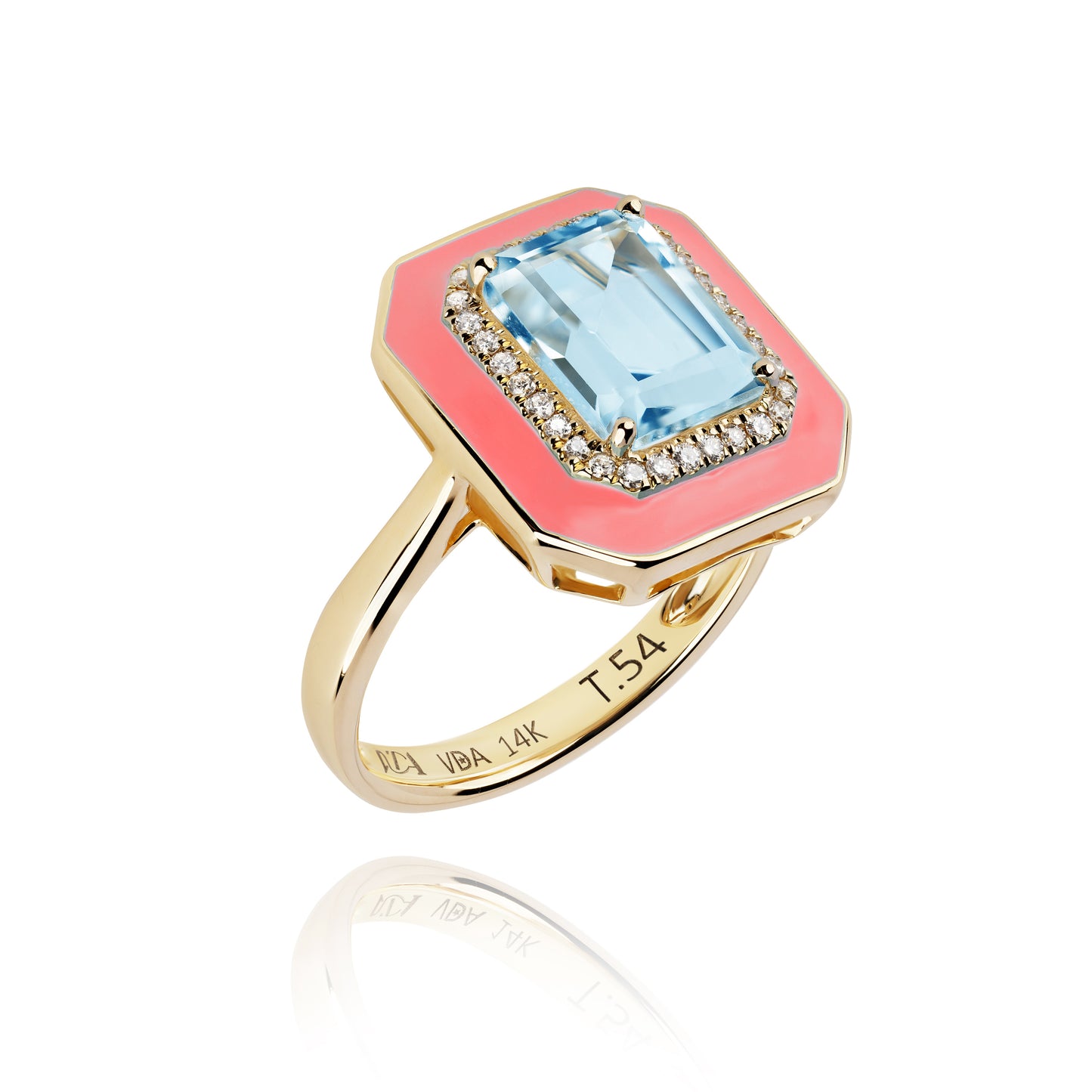 Bague en or 14 carats avec un cabochon décoré d'émail rose corail, de diamants et d'une topaze centrale.