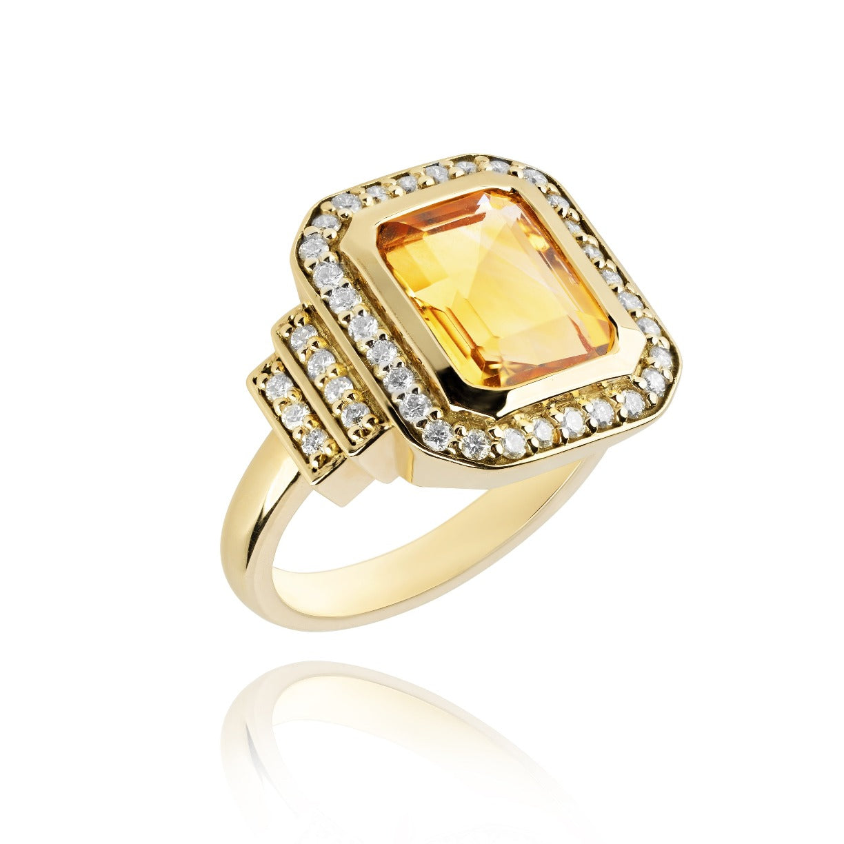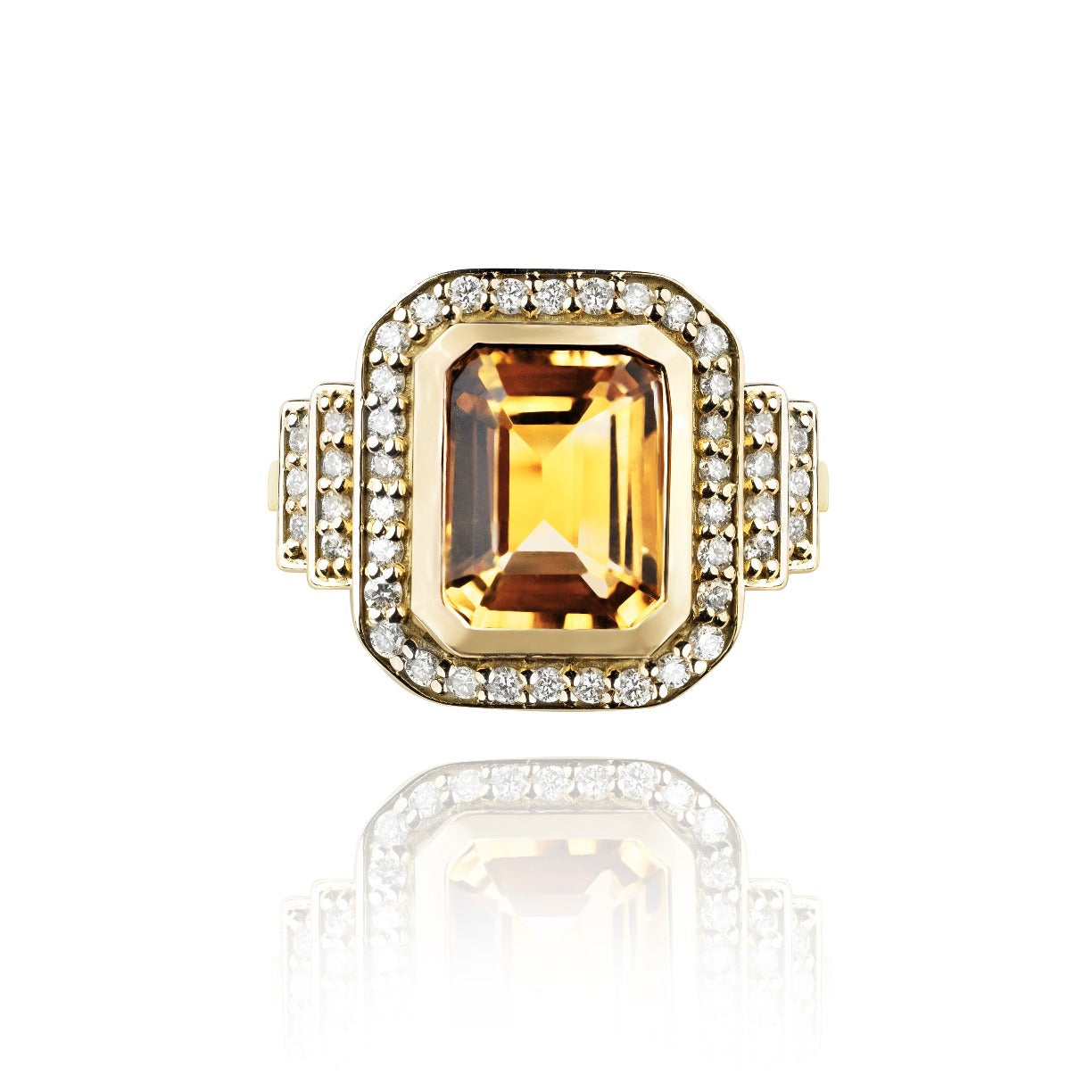 Ravissante bague en or 18 carats recyclé avec en son centre une citrine octogonale sertie de 44 diamants. Sa forme art déco lui donne une allure très élégante. On aime particulièrement sa taille imposante et son design retro très élégant.