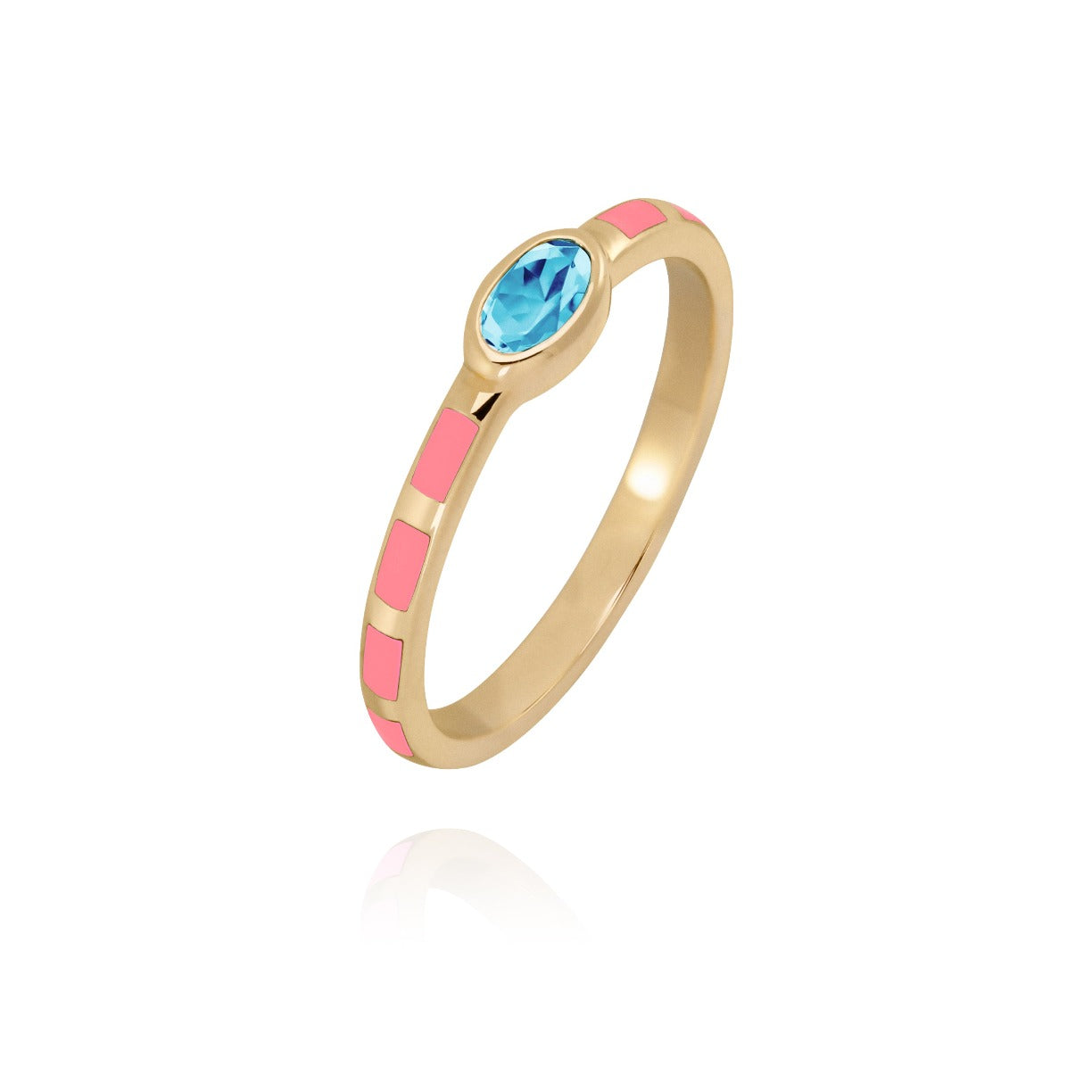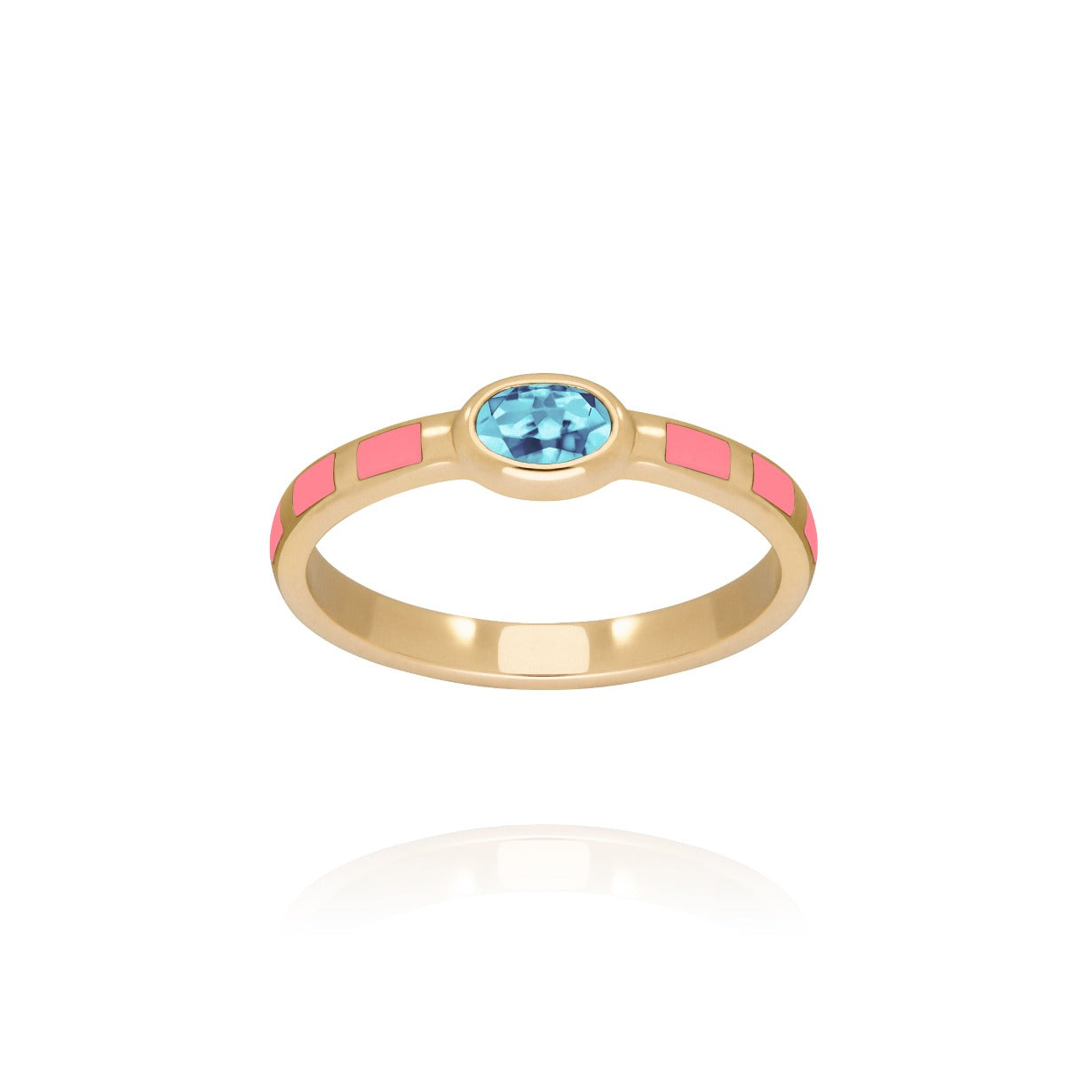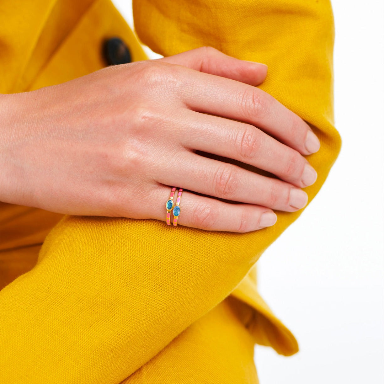 Cette bague en or rose 18 carats est décorée d'interstices colorés d'émail de couleur corail fluo. En son centre un ravissant saphir bleu orne cette alliance solaire pleine de panache. Elle porte le nom de ma fille cadette Marnie, car tout comme elle, cet anneau fin et élégant est un rayon de soleil sur votre main. Cette bague singulière emprunte son audace aux couleurs de l'arc-en-ciel tout en demeurant précieuse. Elle devient encore plus spectaculaire lorsqu'elle est portée en accumulation.