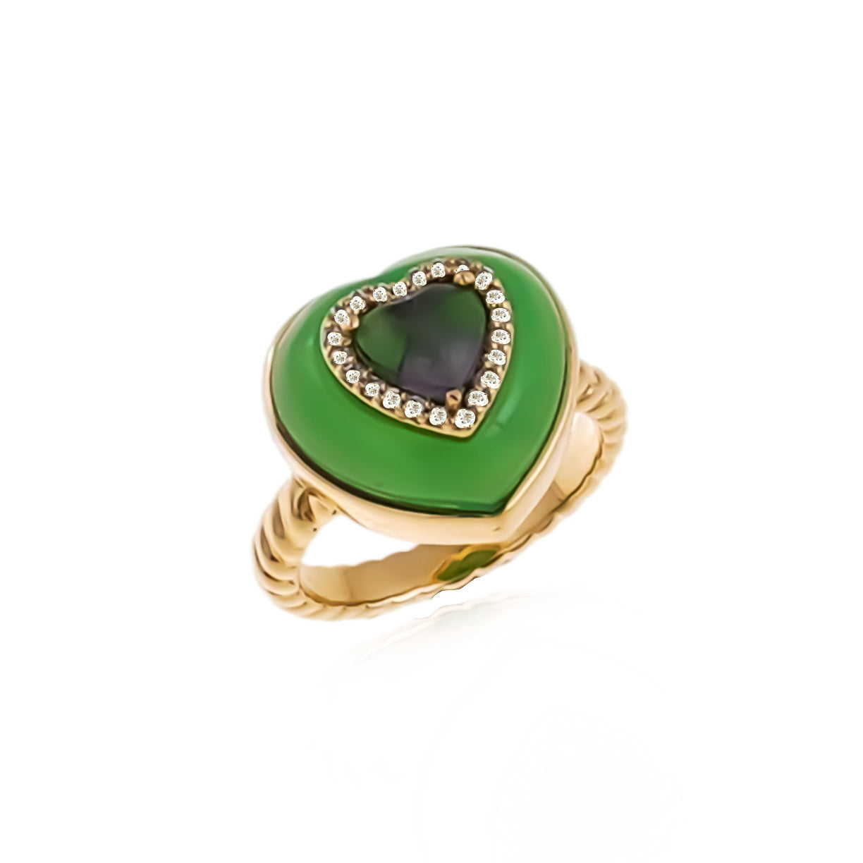 Bague en or jaune 14 carats formant un ravissant petit cœur composé de chrysoprase et d'une émeraude centrale soulignée de 12 diamants.