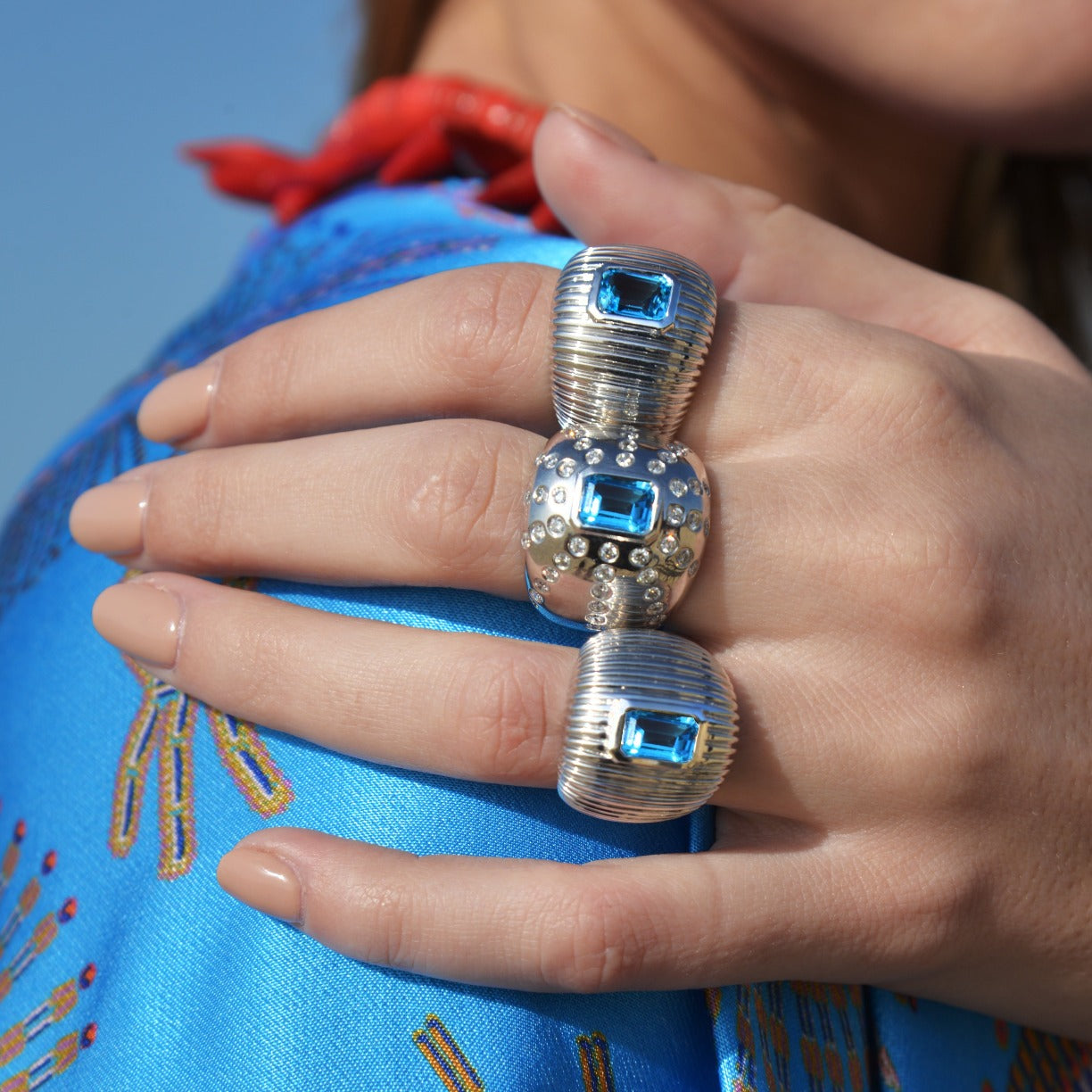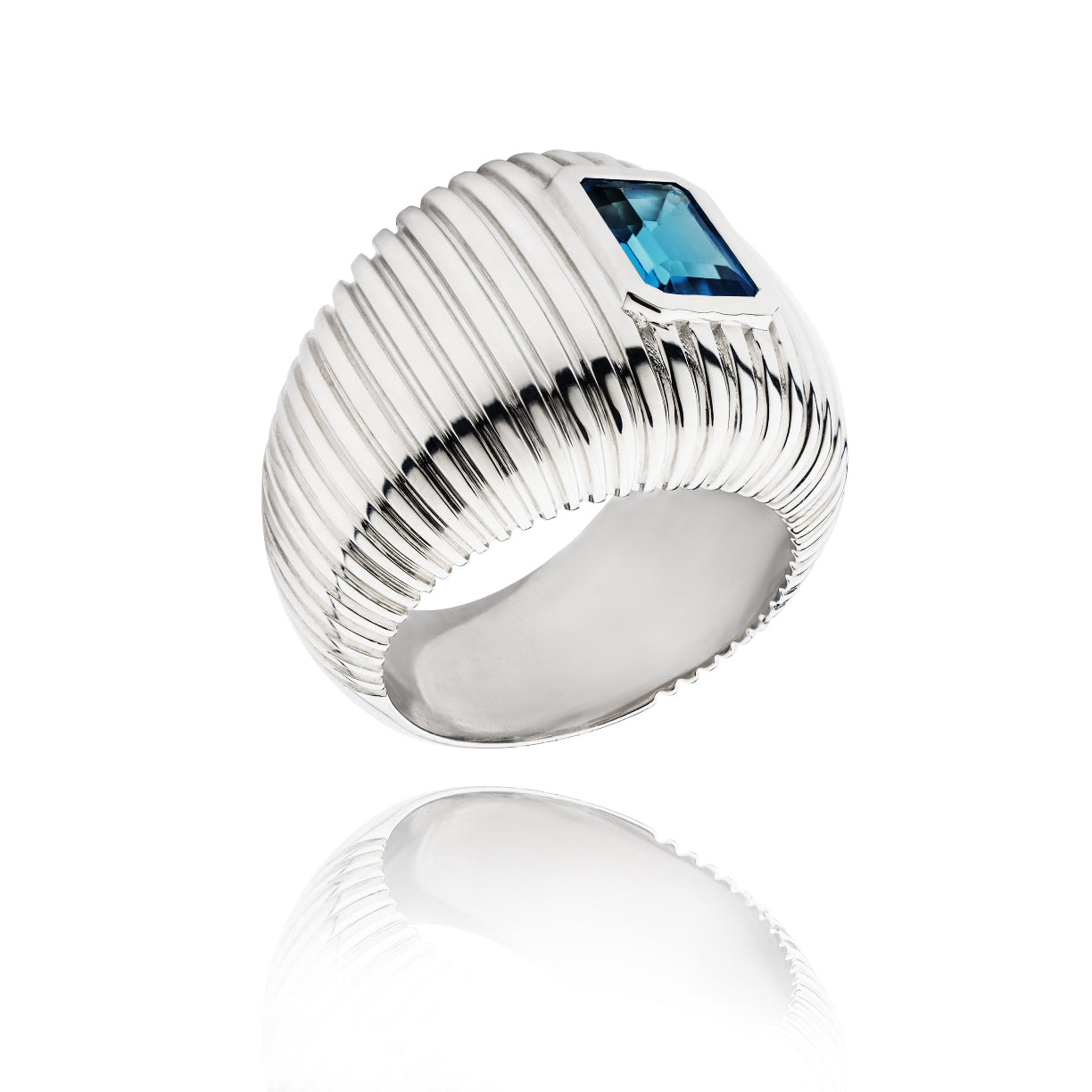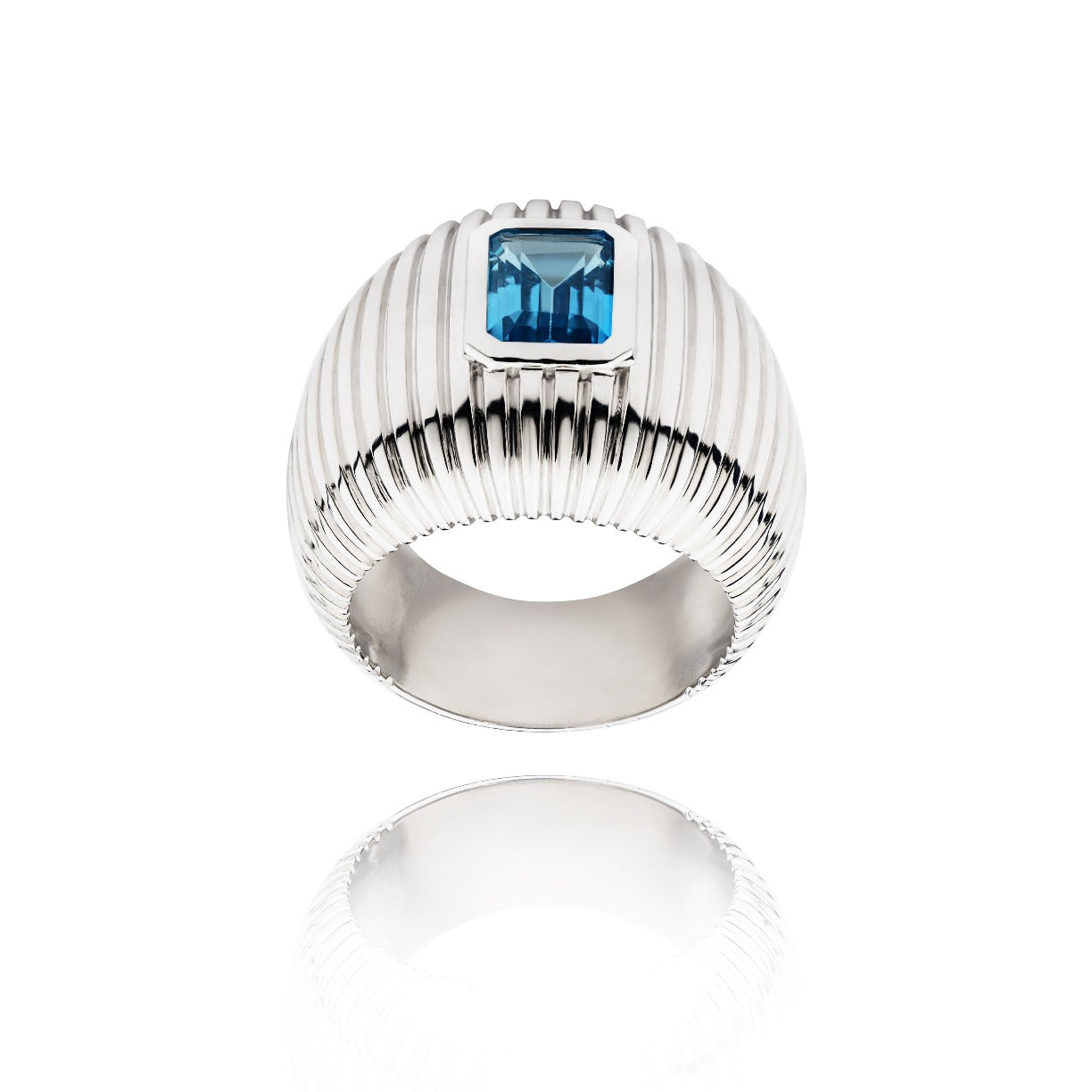 Cette bague imposante et sa structure ronde et striée à l’esprit Art Déco prononcé, évoque de toute évidence les années 20 ! Une bague de type chevalière en argent 925 qui arbore fièrement une majestueuse Topaze blue sky centrale de taille émeraude. Une pièce façonnée à la main, modèle de simplicité qui vient de toute évidence, rejoindre nos bagues iconiques.