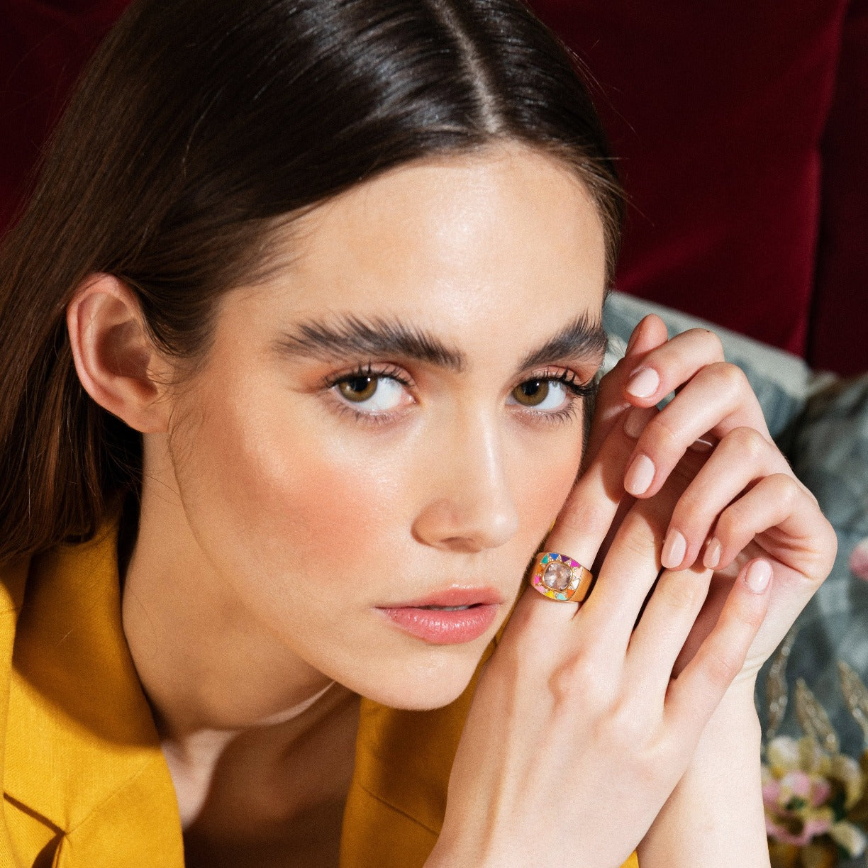 Cette sublime pièce en or jaune 18 carats est une bague exceptionnelle. Sa forme aussi imposante que féminine en fait un joyau moderne. Son cabochon central composé d'un quartz est une étoile majestueuse en l'honneur de ma fille Stella qui lui emprunte son nom. Une bague raffinée, unique, qui mêle le savoir-faire délicat d'un bijou précieux, et la fantaisie magique par la couleur arc-en-ciel qui symbolise la vie. Turquoise pour la mer, bleu pour le ciel, fuchsia pour les fleurs, rose pour l'amour, orange pour la passion et blanc pour cette nouvelle page qui restera toujours à écrire...