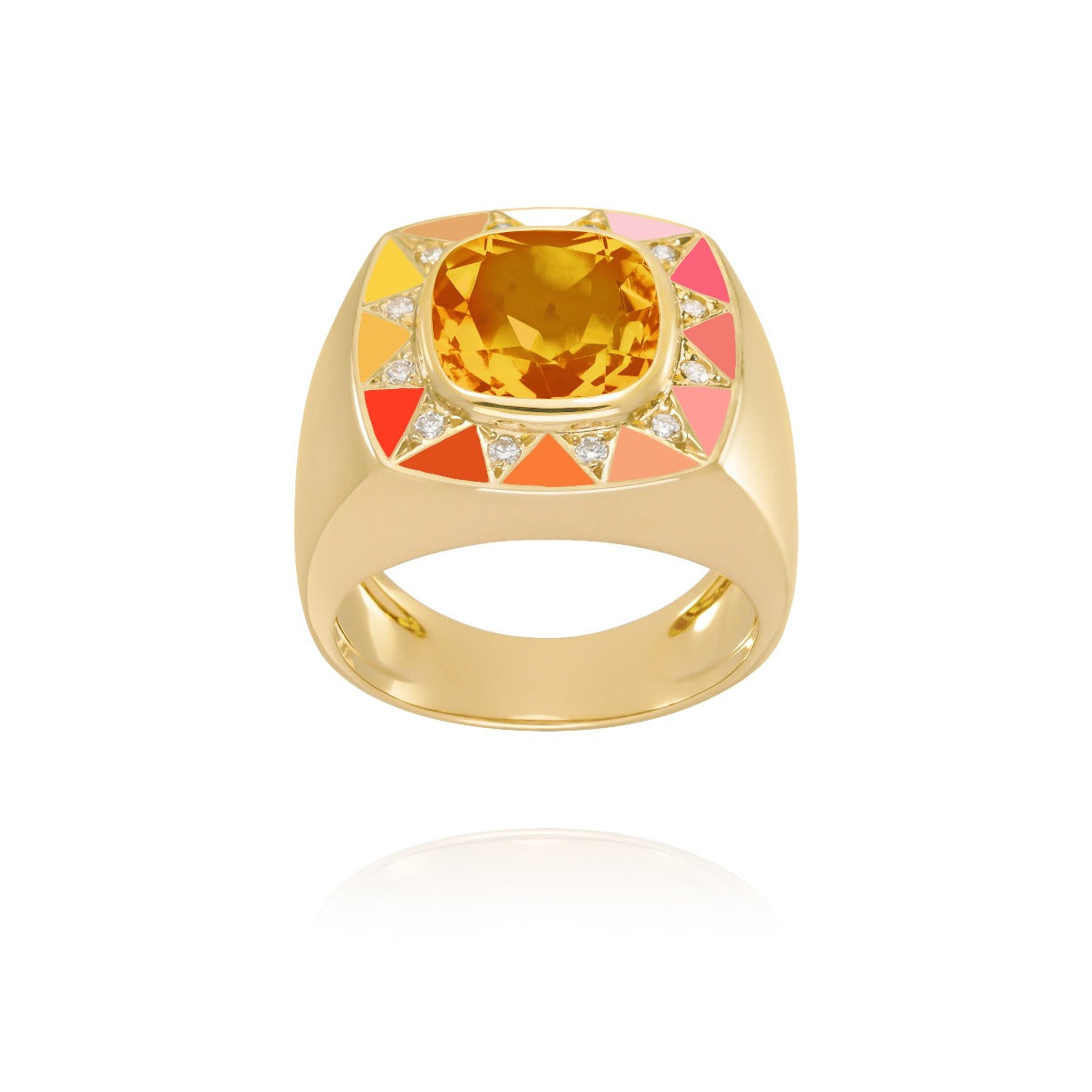 Bague en Or 18 carats de forme jonc ou imposante chevalière, ornée en son centre d'une Citrine rayonnante telle une étoile décorée de diamants sertis en triangle et d'émail en dégradé coucher de soleil.