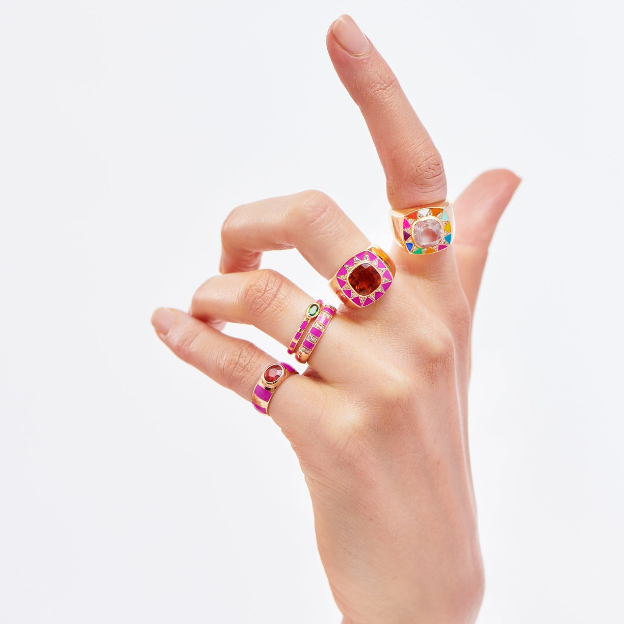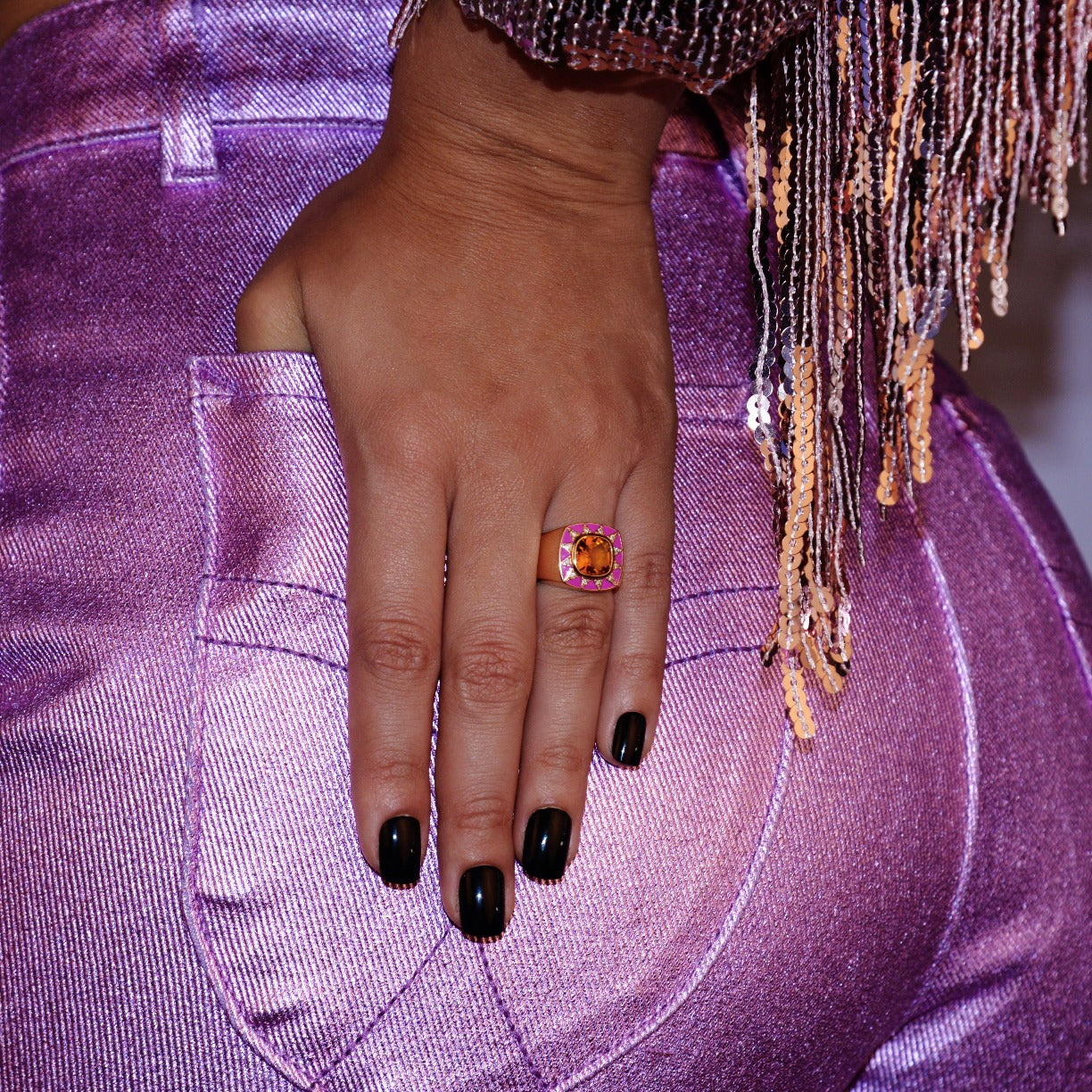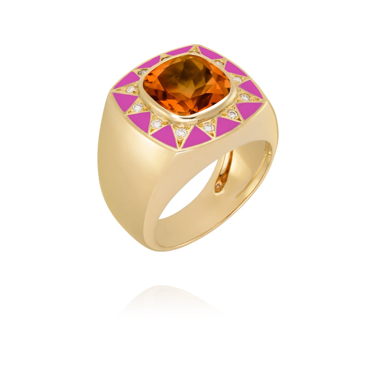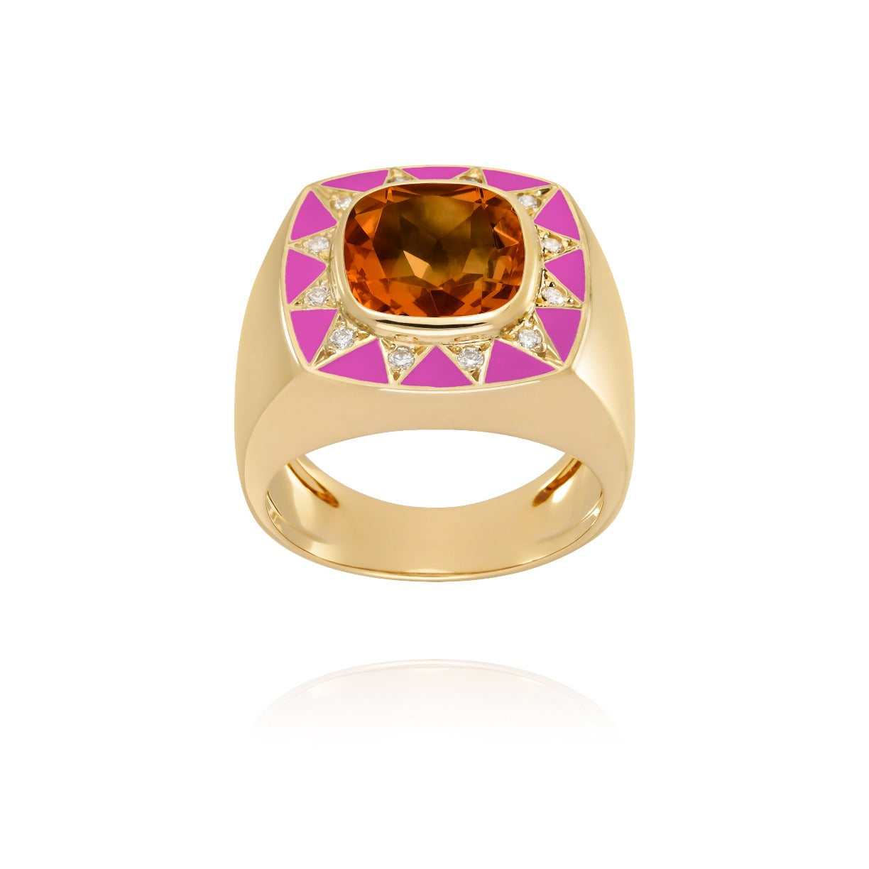 Bague en Or 18 carats de forme jonc ou imposante chevalière, ornée en son centre d'une Citrine de Madère flamboyante, rayonnant telle une étoile décorée de diamants sertis en triangle et d'émail fuchsia.