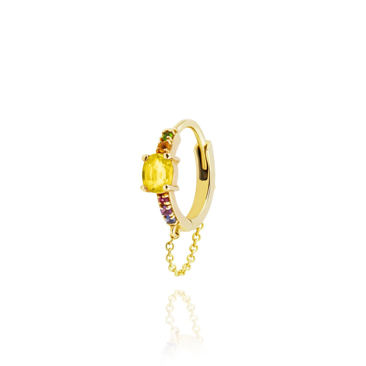 Boucle d'oreille style mini créole en or jaune 14 carats ornée de sept pierres en dégradé arc-en-ciel et d'un saphir jaune oval. Une délicate chaîne fait le lien entre le devant et le dos de la boucle. Vendue à l'unité.