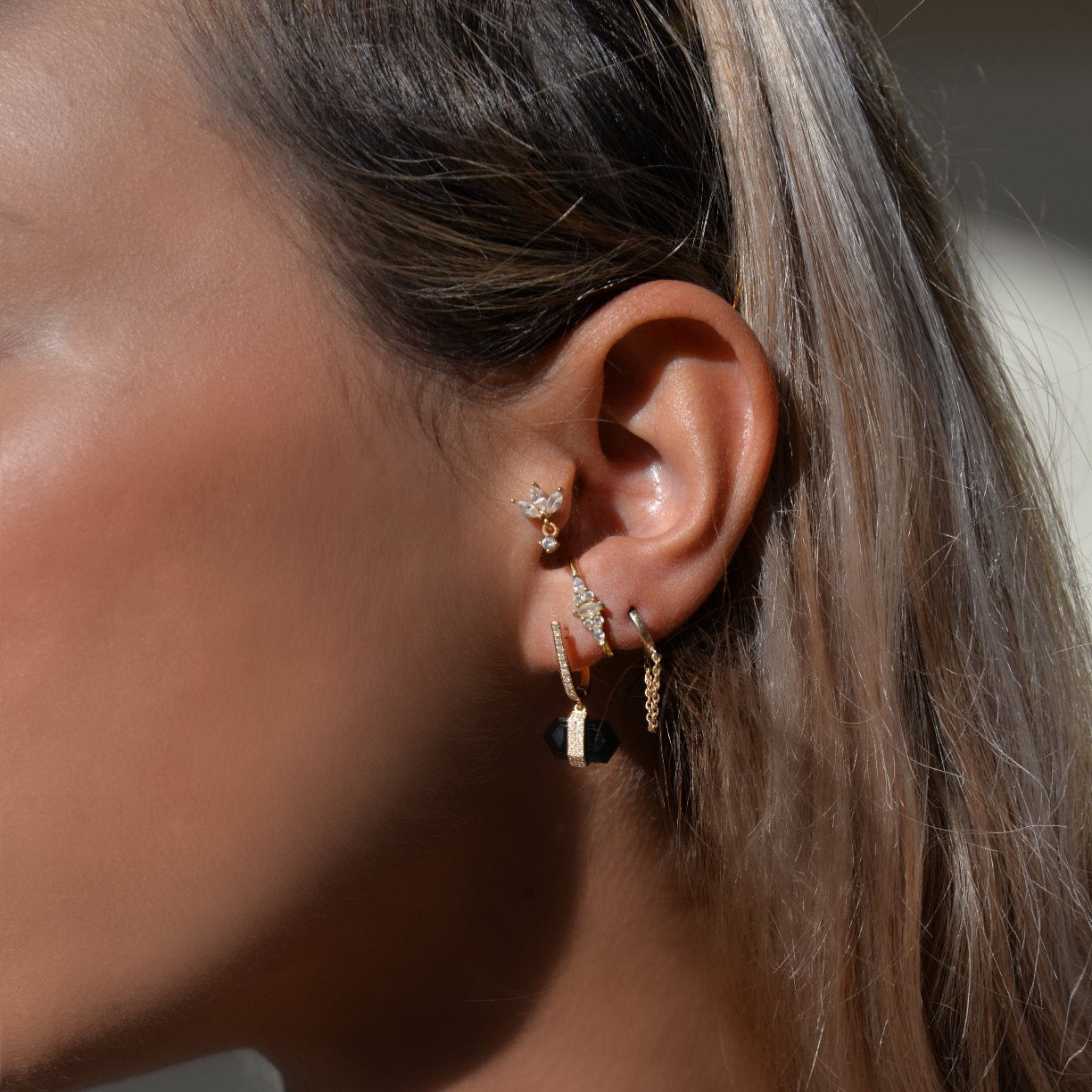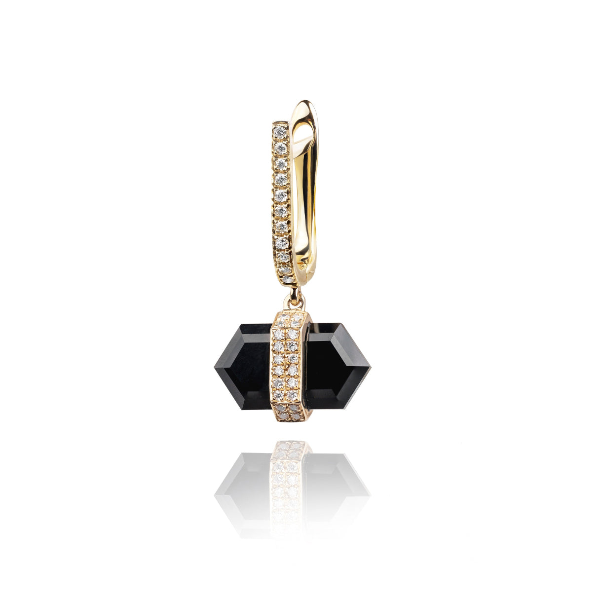 Splendide boucle d'oreille en or 14 carats pavée de ravissants diamants. Elle est décorée d'une majestueuse onyx facettée. Vendue à l'unité.