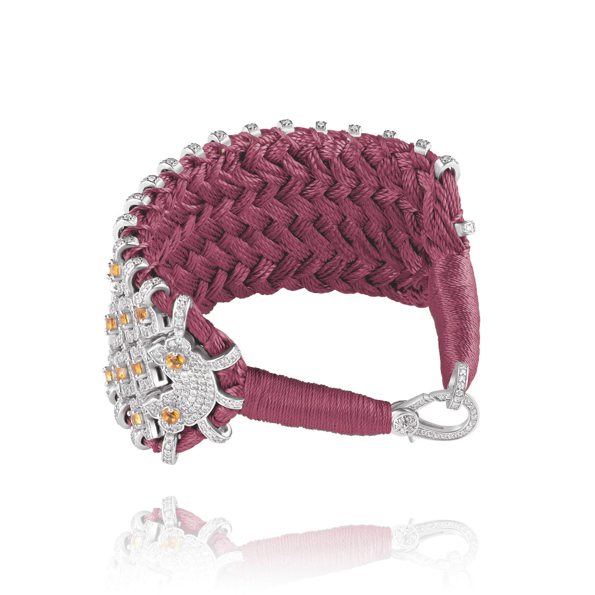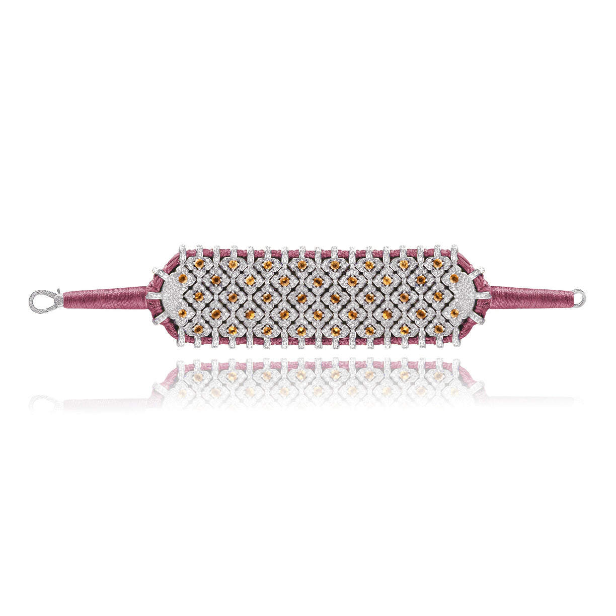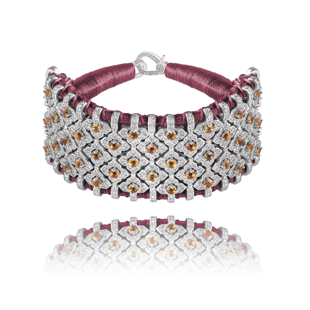 Large manchette en fil de coton tressé de couleur bambou décorée d'une structure en argent 925 entièrement pavée de diamants et de pierres citrines.