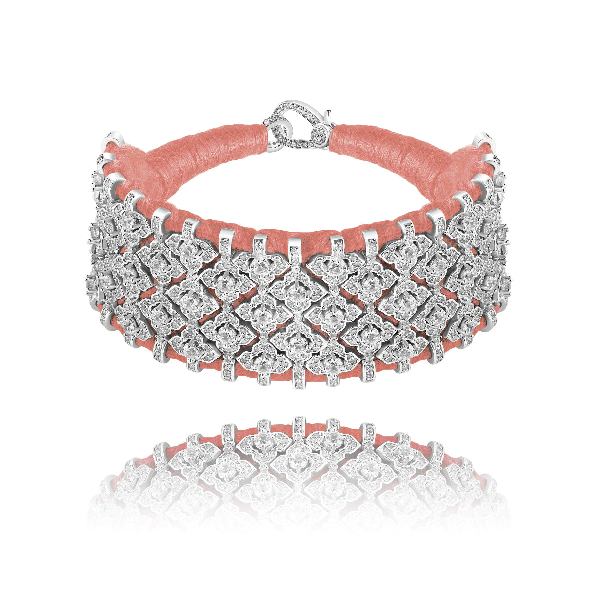 Large manchette en fil de coton tressé de couleur blush décorée d'une structure en argent 925 entièrement pavée de diamants et de pierres zircons.