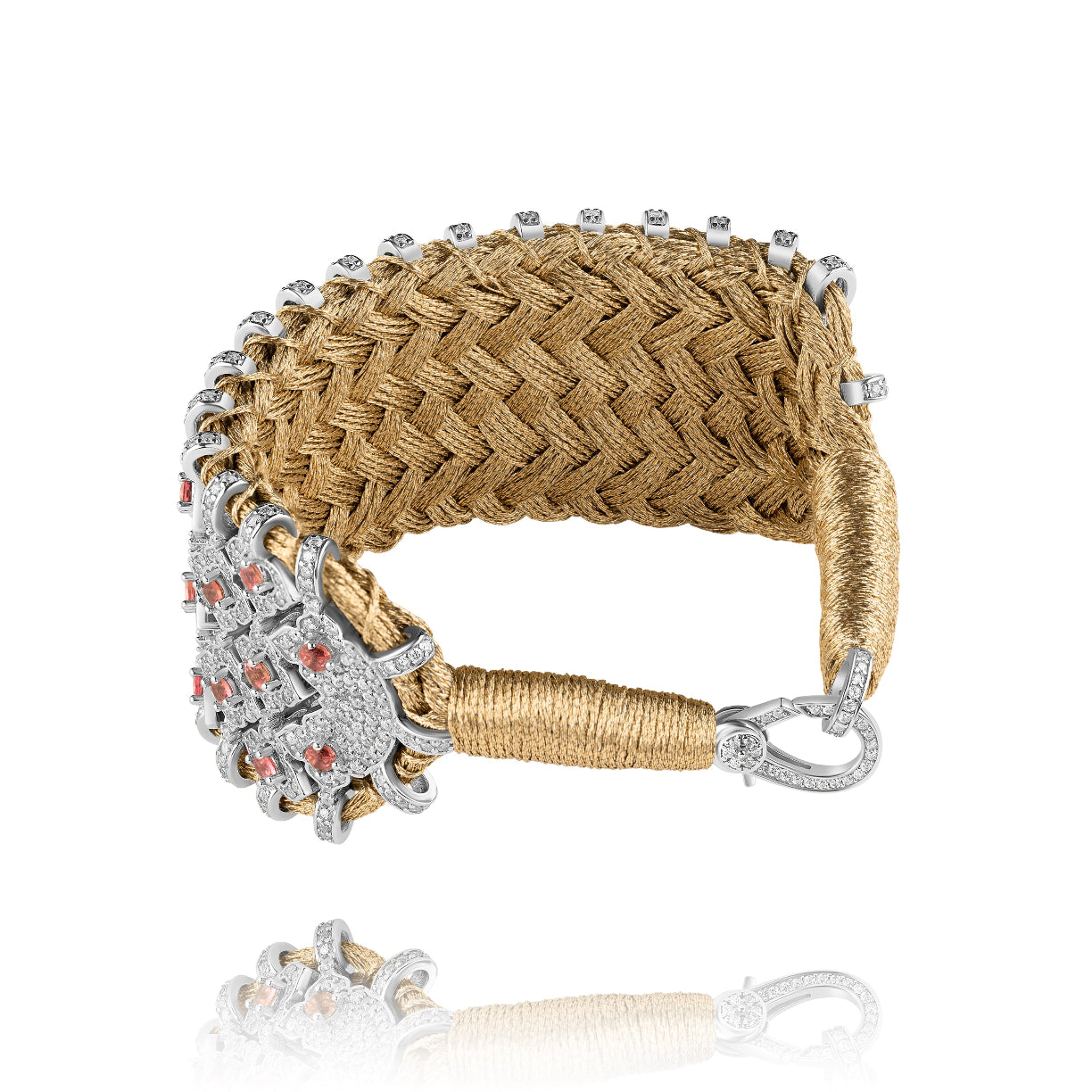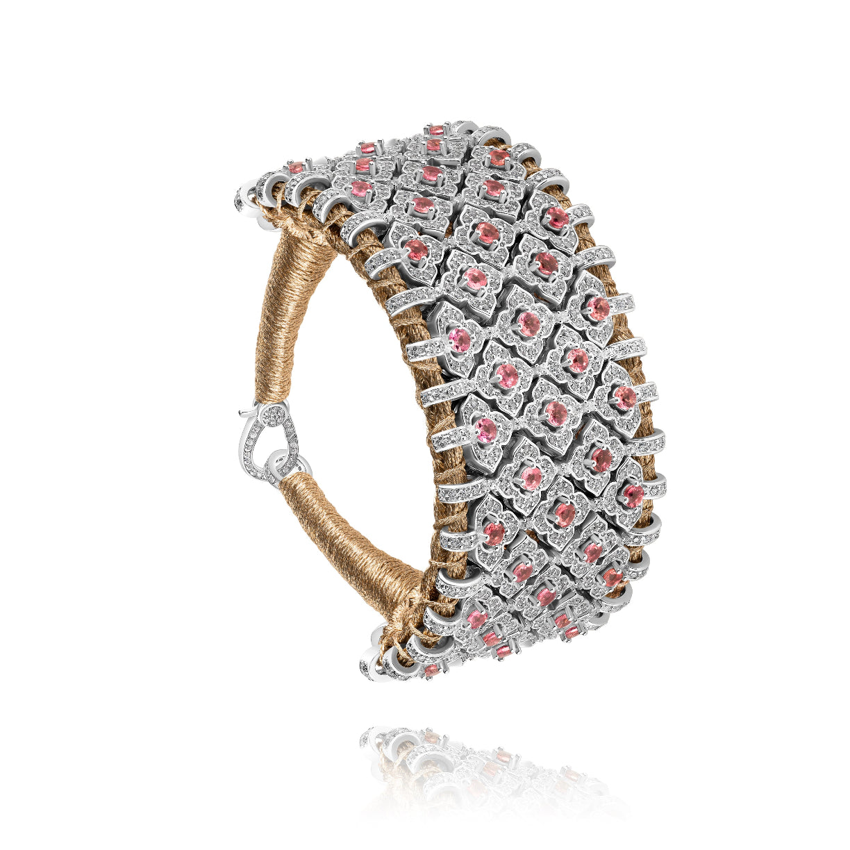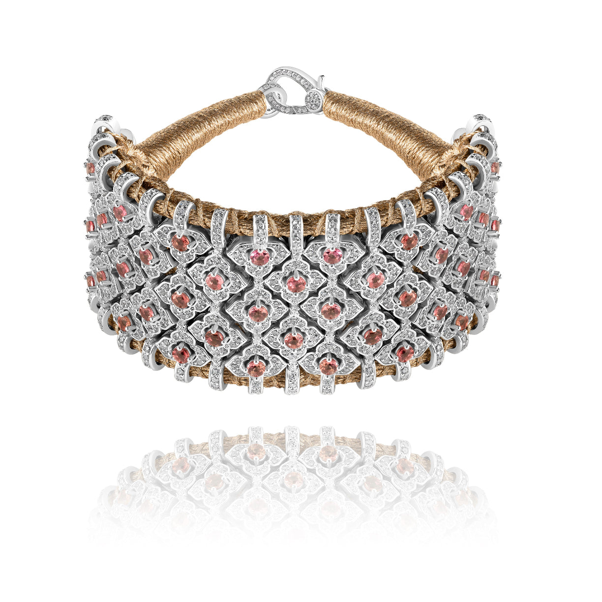 Large manchette en fil de lurex tressé de couleur brass décorée d'une structure en argent 925 entièrement pavée de diamants et de pierres tourmalines.