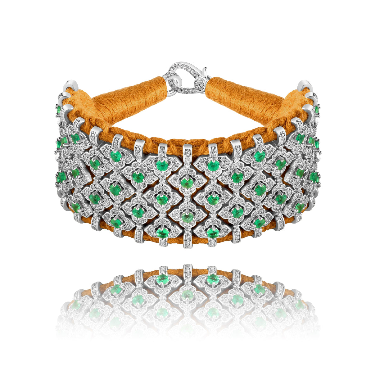 Large manchette en fil de coton tressé de couleur camel décorée d'une structure en argent 925 entièrement pavée de diamants et de pierres émeraudes.