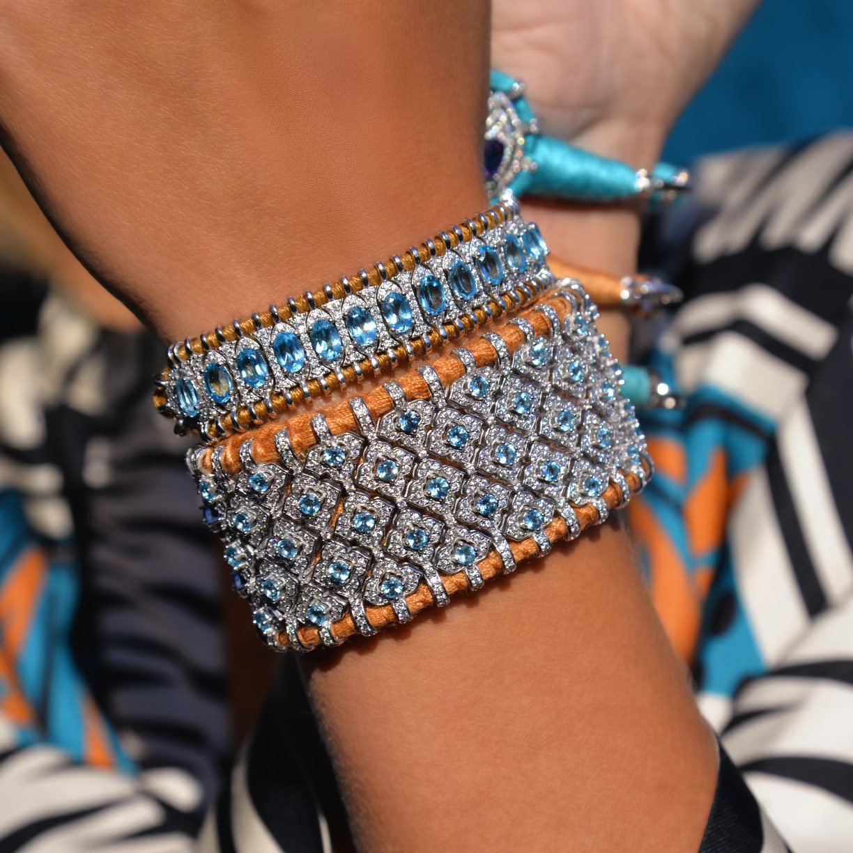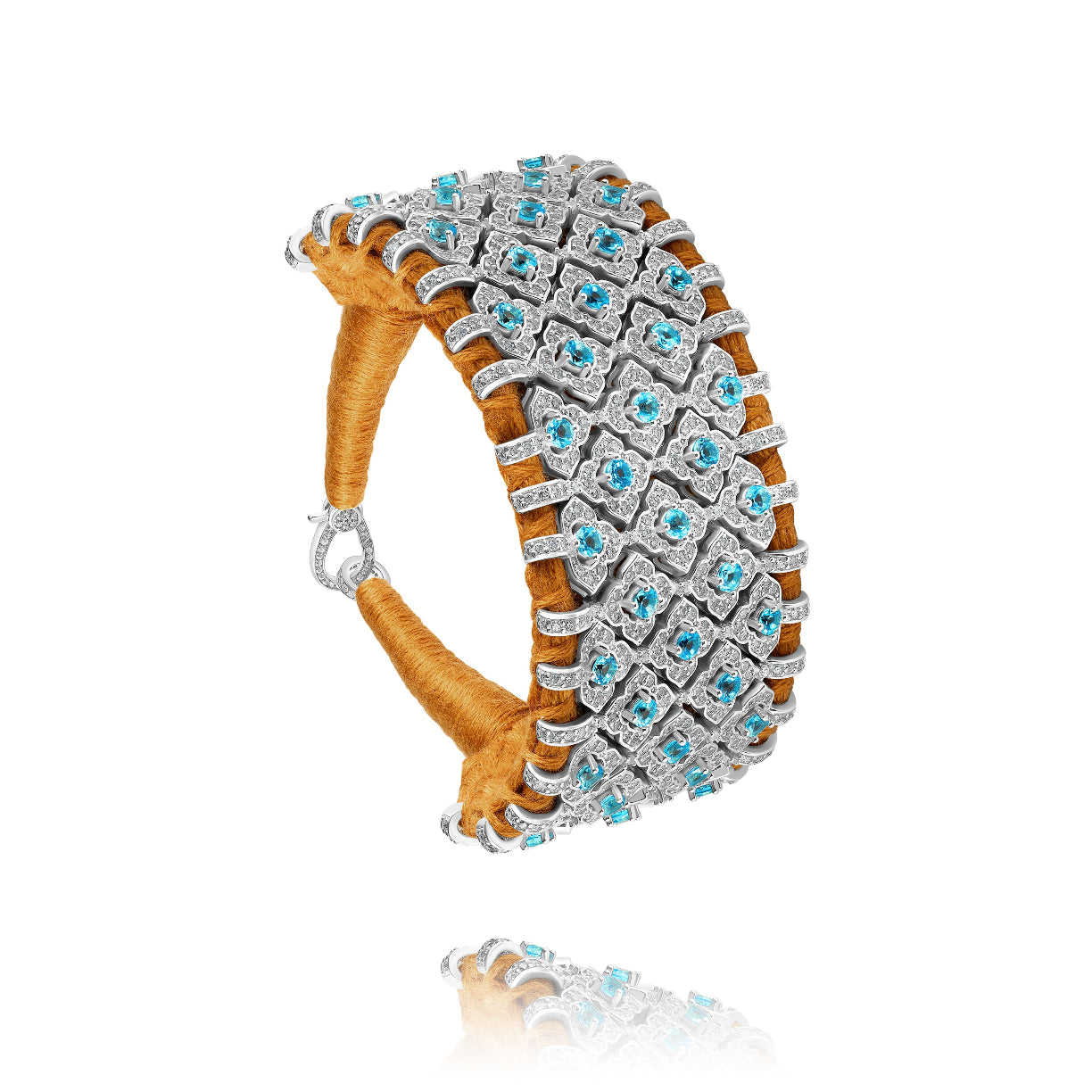 Large manchette en fil de coton tressé de couleur camel décorée d'une structure en argent 925 entièrement pavée de diamants et de pierres topazes.