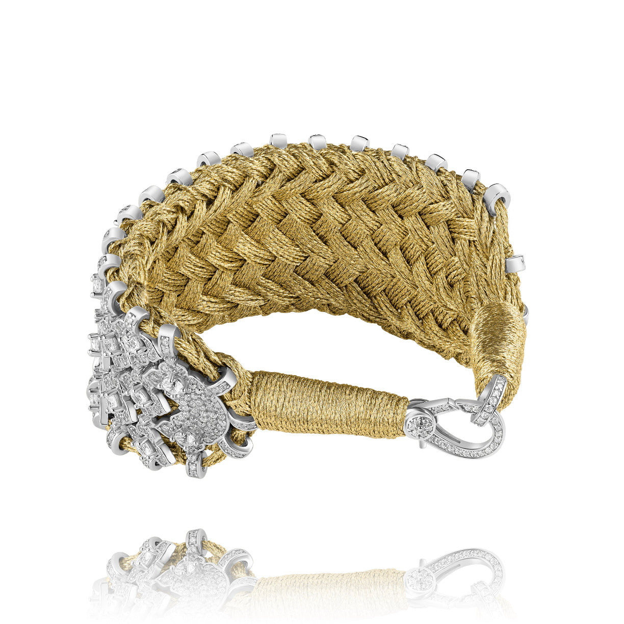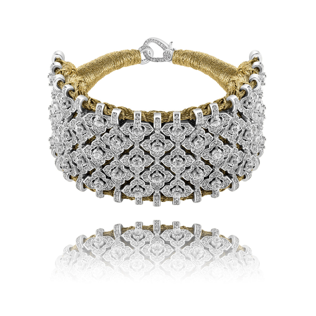 Large manchette en fil de lurex tressé de couleur gold décorée d'une structure en argent 925 entièrement pavée de diamants et de pierres zircons.