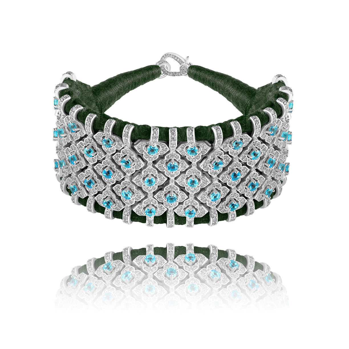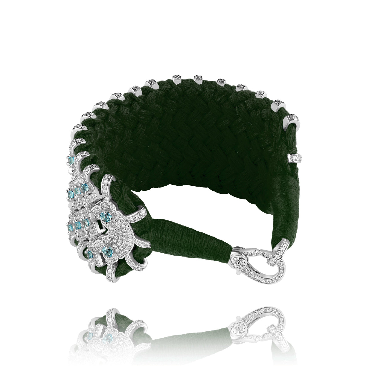 Large manchette en fil de coton tressé de couleur kaki décorée d'une structure en argent 925 entièrement pavée de diamants et de pierres topazes.
