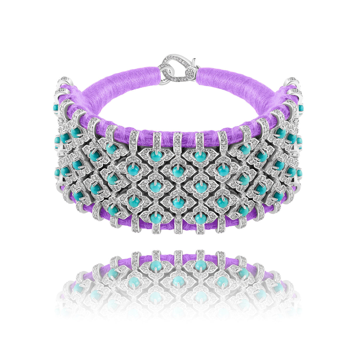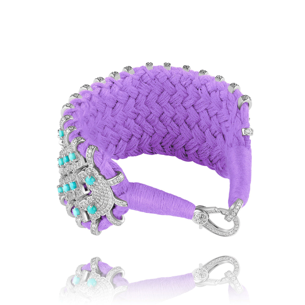 Large manchette en fil de coton tressé de couleur lilac décorée d'une structure en argent 925 entièrement pavée de diamants et de pierres turquoises.